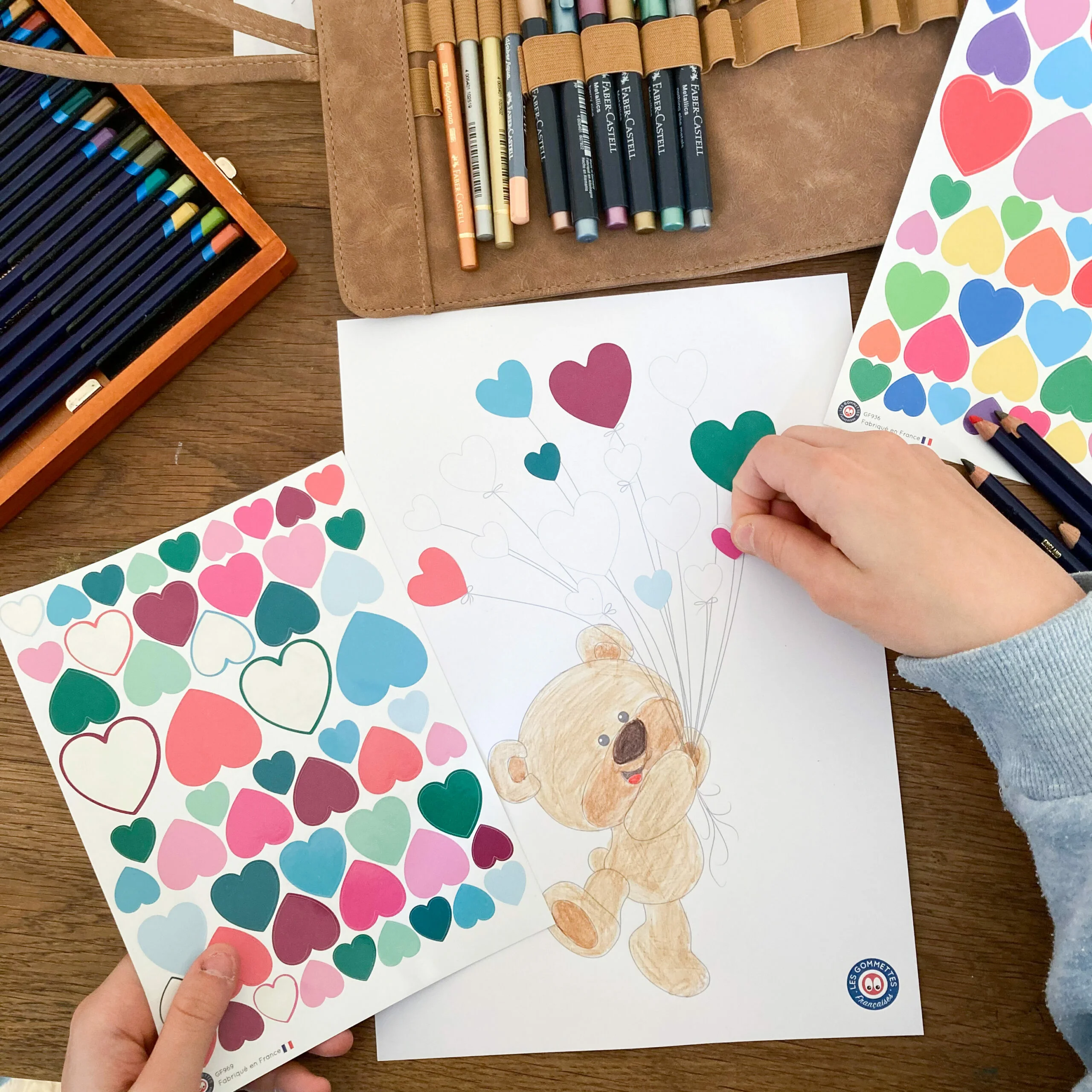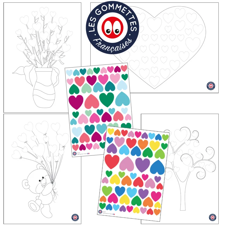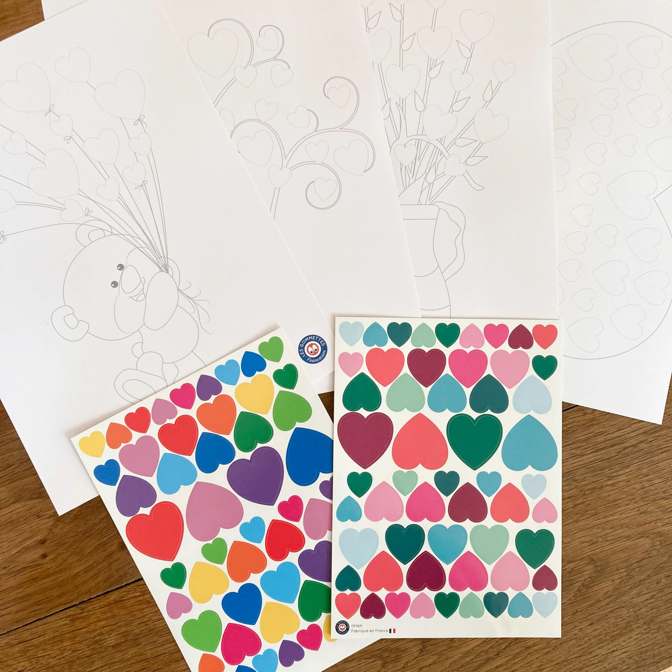 Le kit comprend : 110 gommettes Coeur (2 planches A5) + 4 dessins Amour à décorer et à colorier .