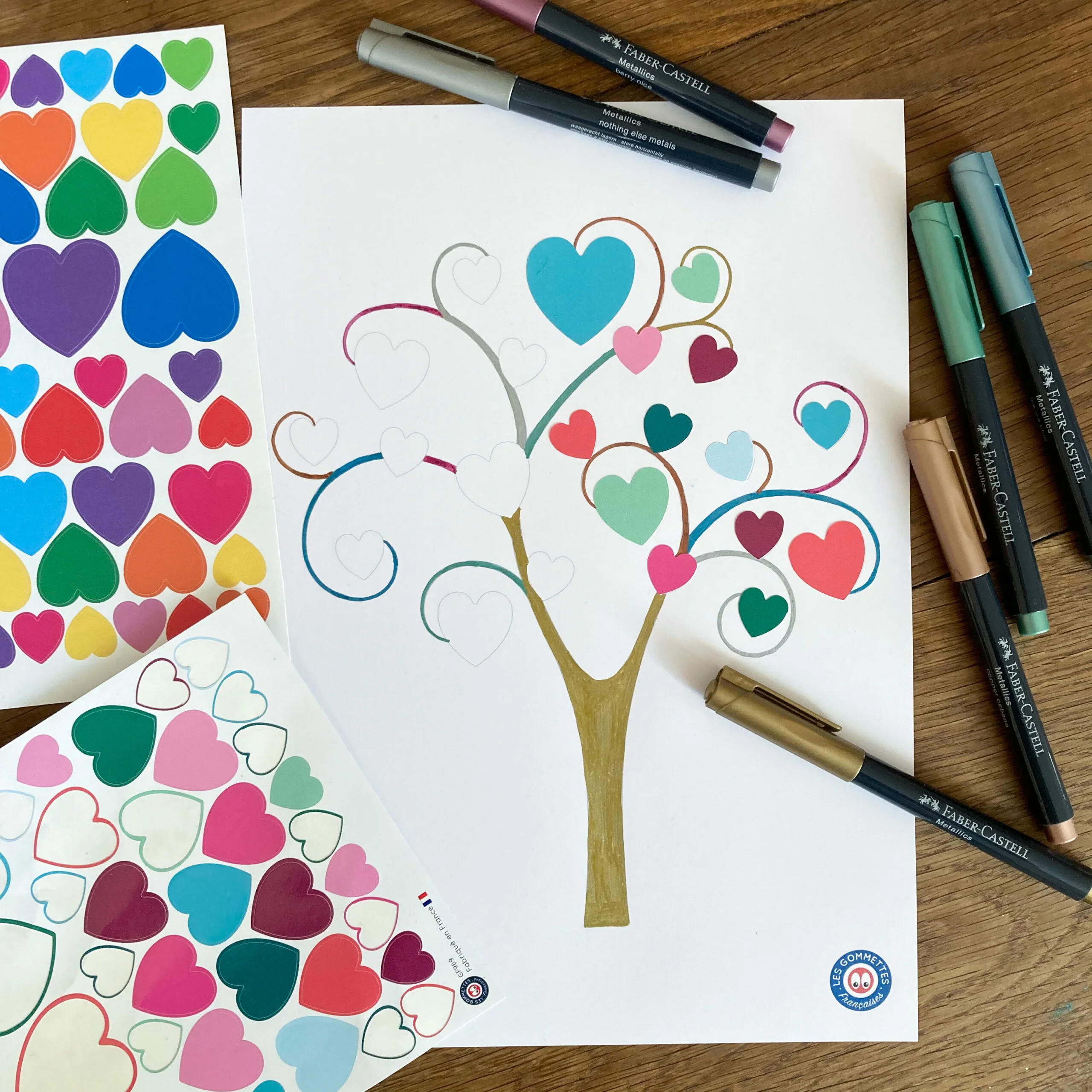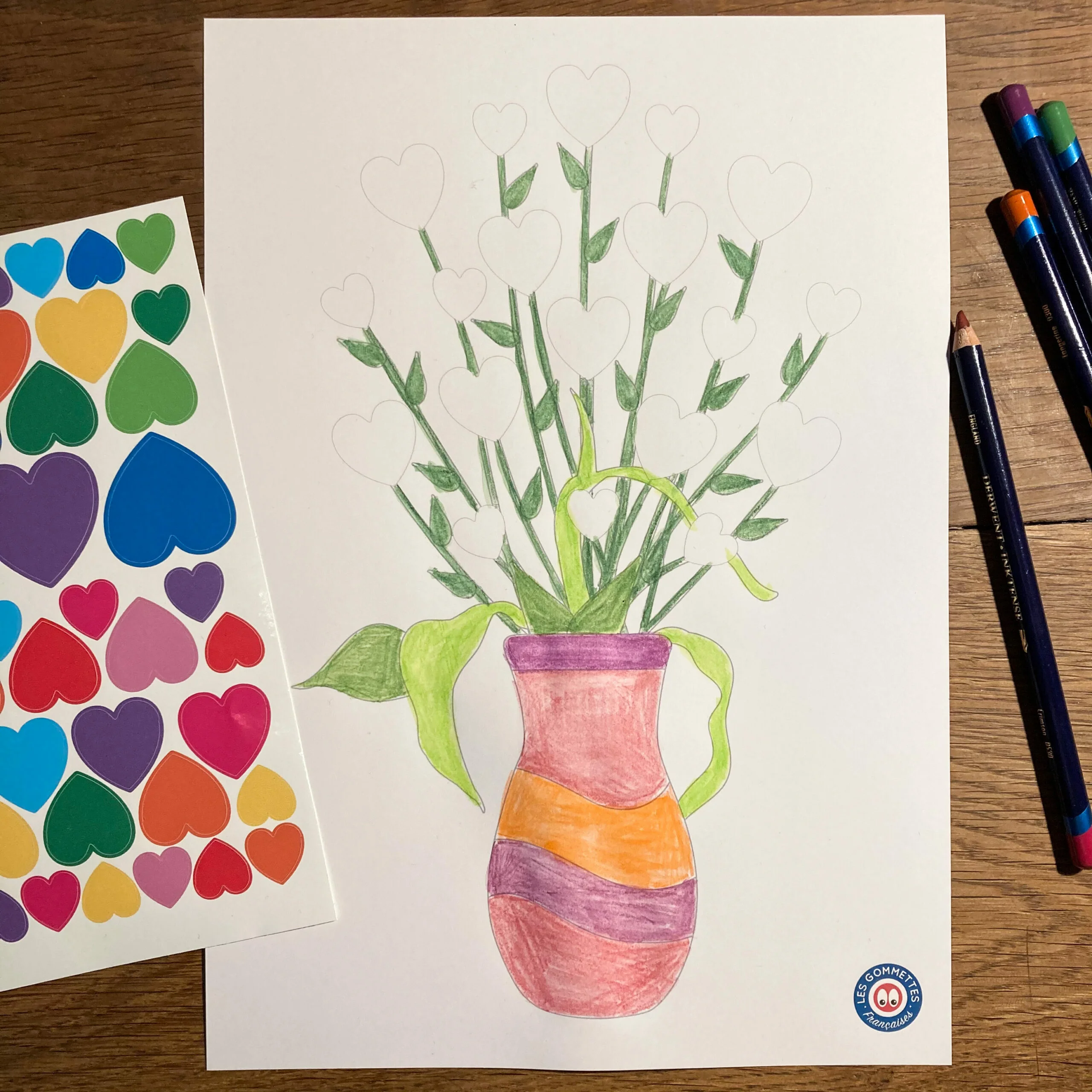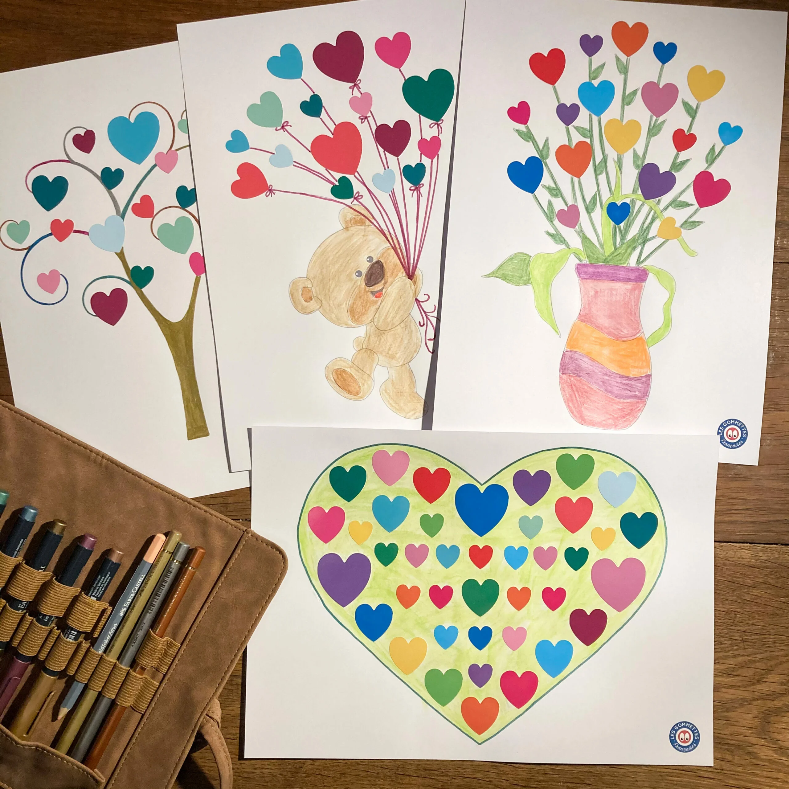 Décore les 4 dessins avec les 110 gommettes coeur de tailles et de couleurs différentes. Tu pourras les colorier pour en faire des superbes tableaux.
