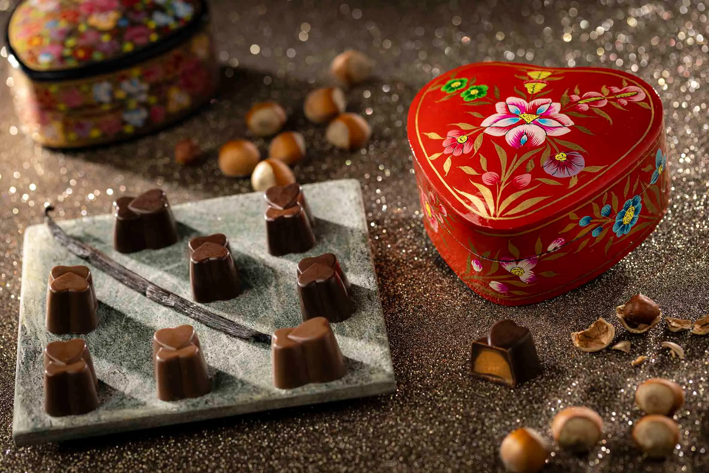 Fourrage au praliné NOISETTES* 29% (NOISETTES* 14,5%, sucre de canne*, fleur de sel, poudre de vanille*), sucre de canne*, pâte de cacao*, beurre de cacao*, poudre de LAIT entier*.