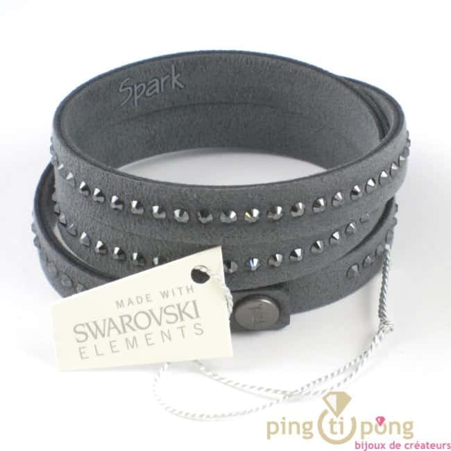 Ce petit bracelet bijoux fantaisie de marque Spark est fait d’une lanière double épaisseur en alcantara gris foncé dans laquelle est incrustée une ligne de cristaux de swarovski gris également.