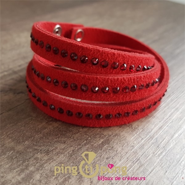 Ce petit bracelet bijoux fantaisie de marque Spark est constitué d’une lanière double épaisseur en alcantara rouge dans laquelle est incrustée une ligne de cristaux de swarovski rouge également.