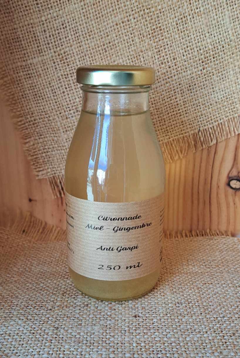 Composition : Eau, Miel (8,6 %), jus de citron* (3,9 %), menthe (0,9 %) * produits issus de notre filière « lutte contre le gaspillage alimentaire »