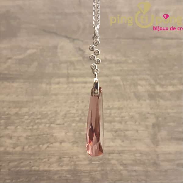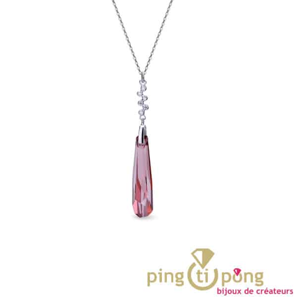 Bijou de luxe en argent rhodié orné d’un long cristal taillé de Swarovski de couleur rose.