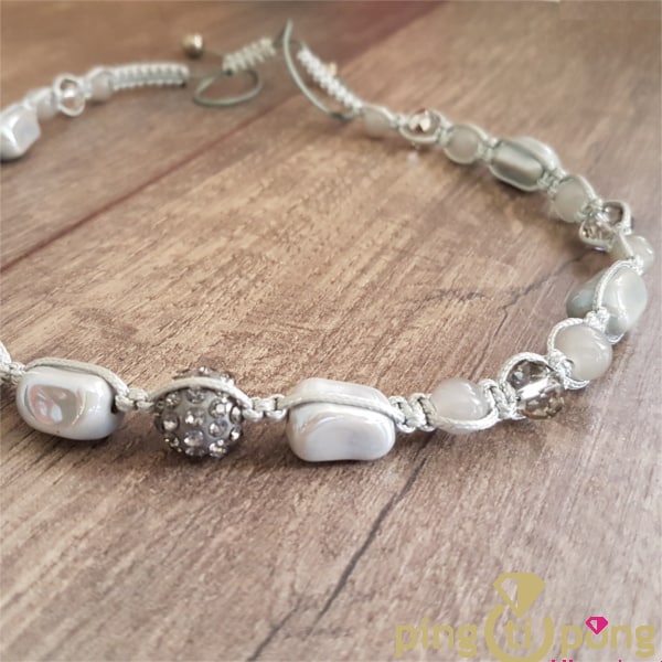 Collier lacette de type shamballa : perles de différentes formes en pierres, gris clair et nacrées