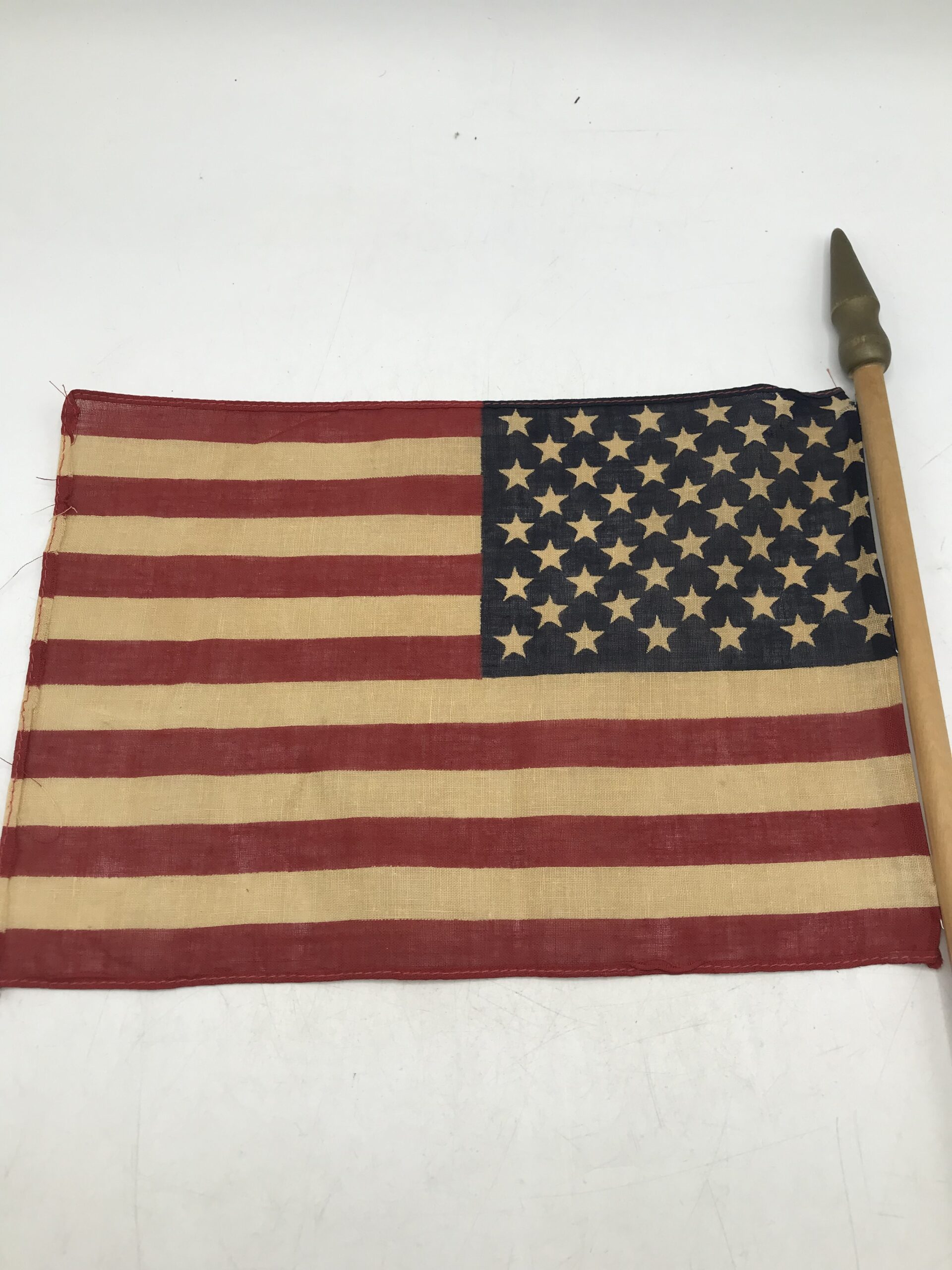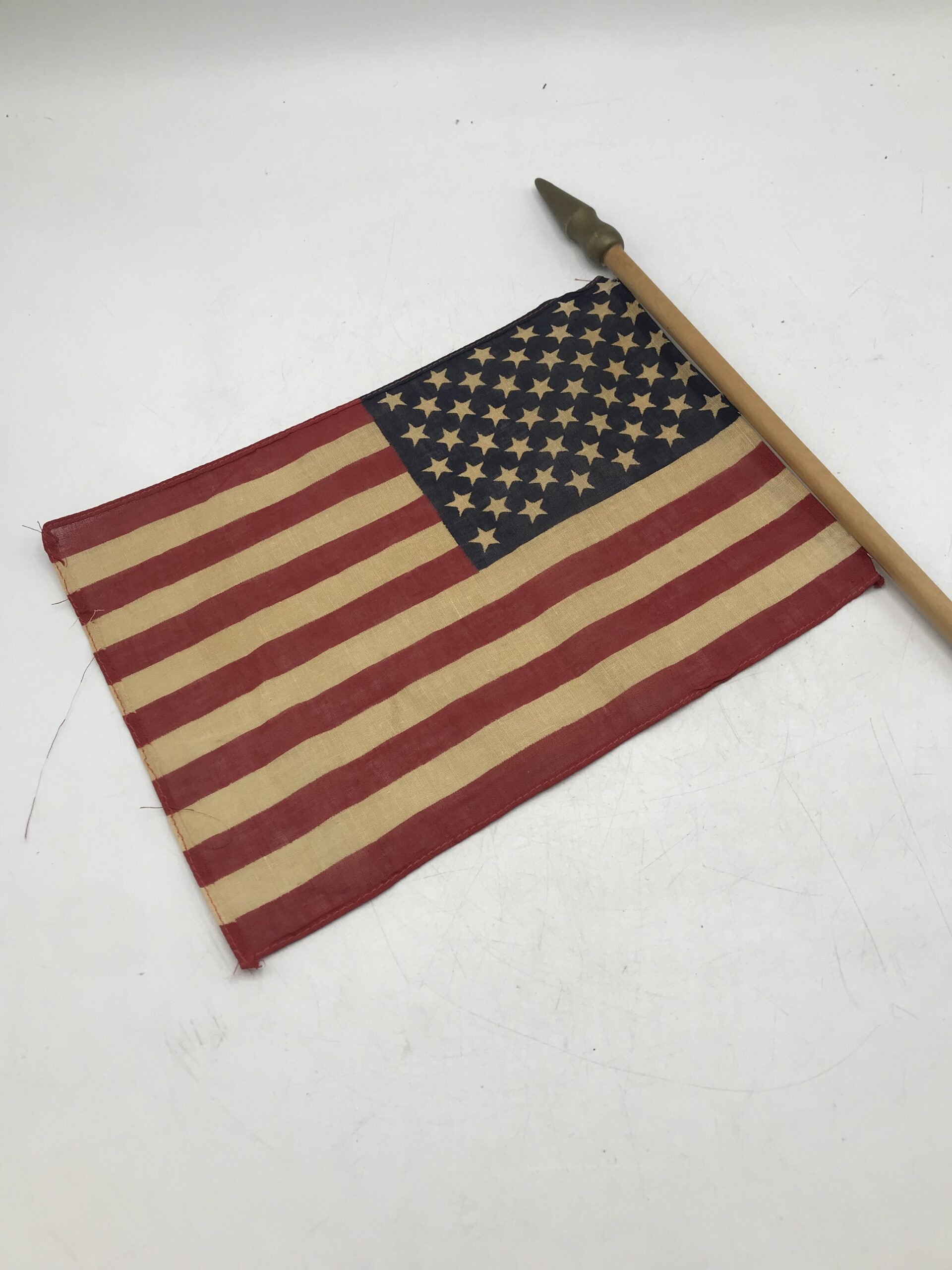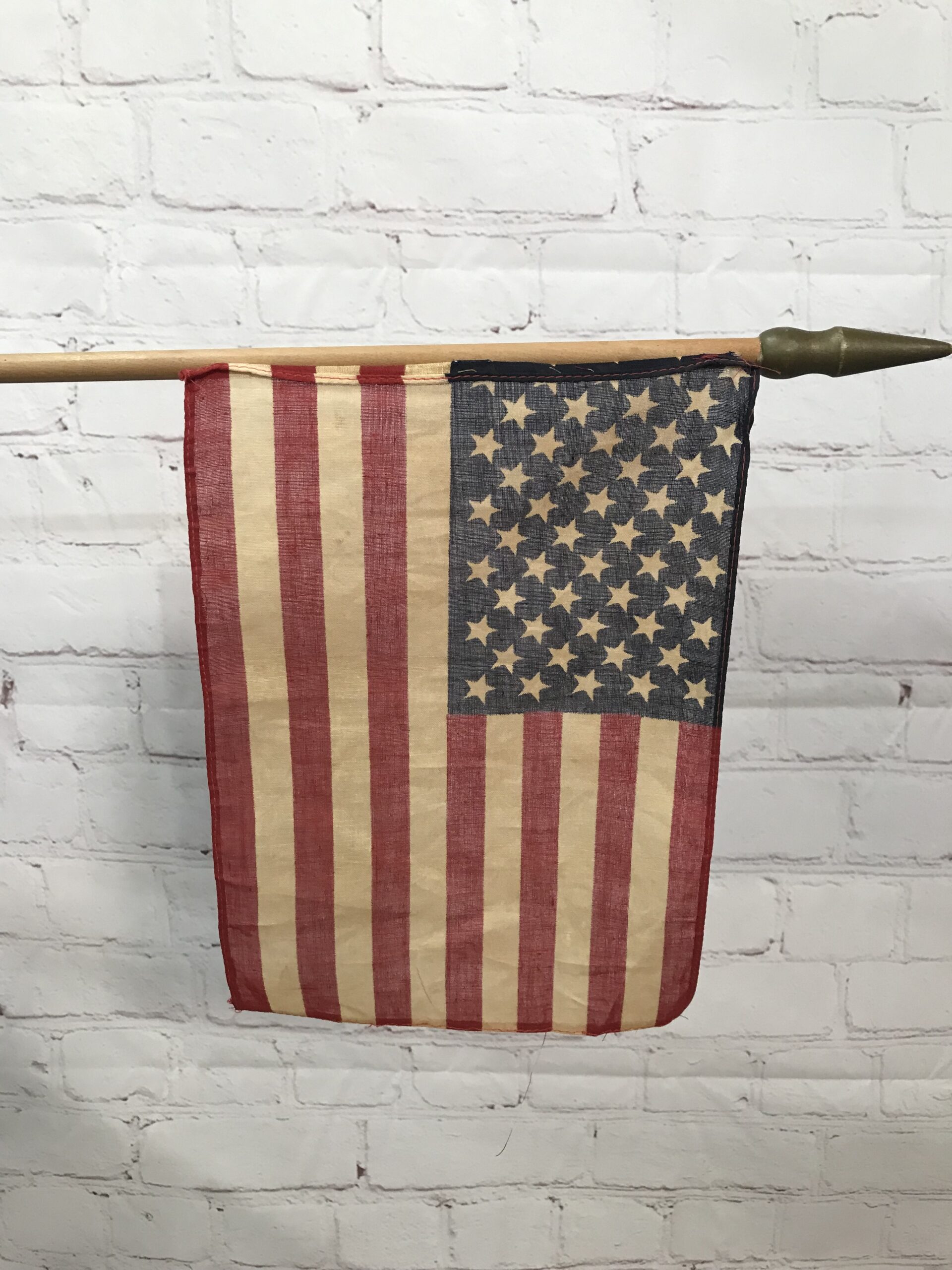 Drapeau militaire US vintage en coton. Très bel objet témoignage fort d’une époque. Ce drapeau original à traversé les époques pour que l’on garde en mémoire les temps forts du passé. Il est composé une tige en bois, avec le drapeau US en coton. La partie drapeau en coton mesure 27 cm par 19 cm. La tige en bois mesure 66 cm. Il est en bon état. Un objet de déco pour les amoureux d’histoire et de vintage.