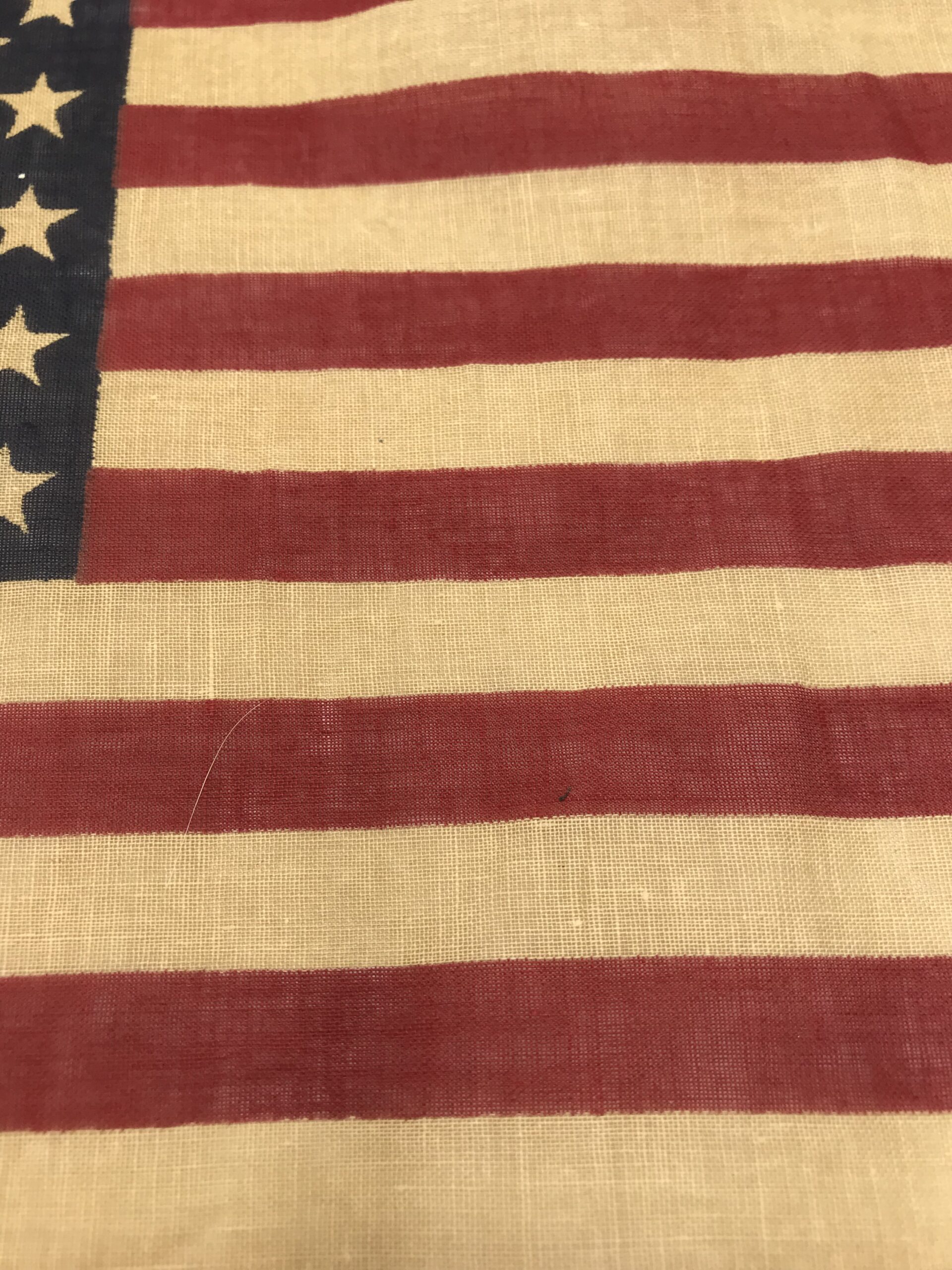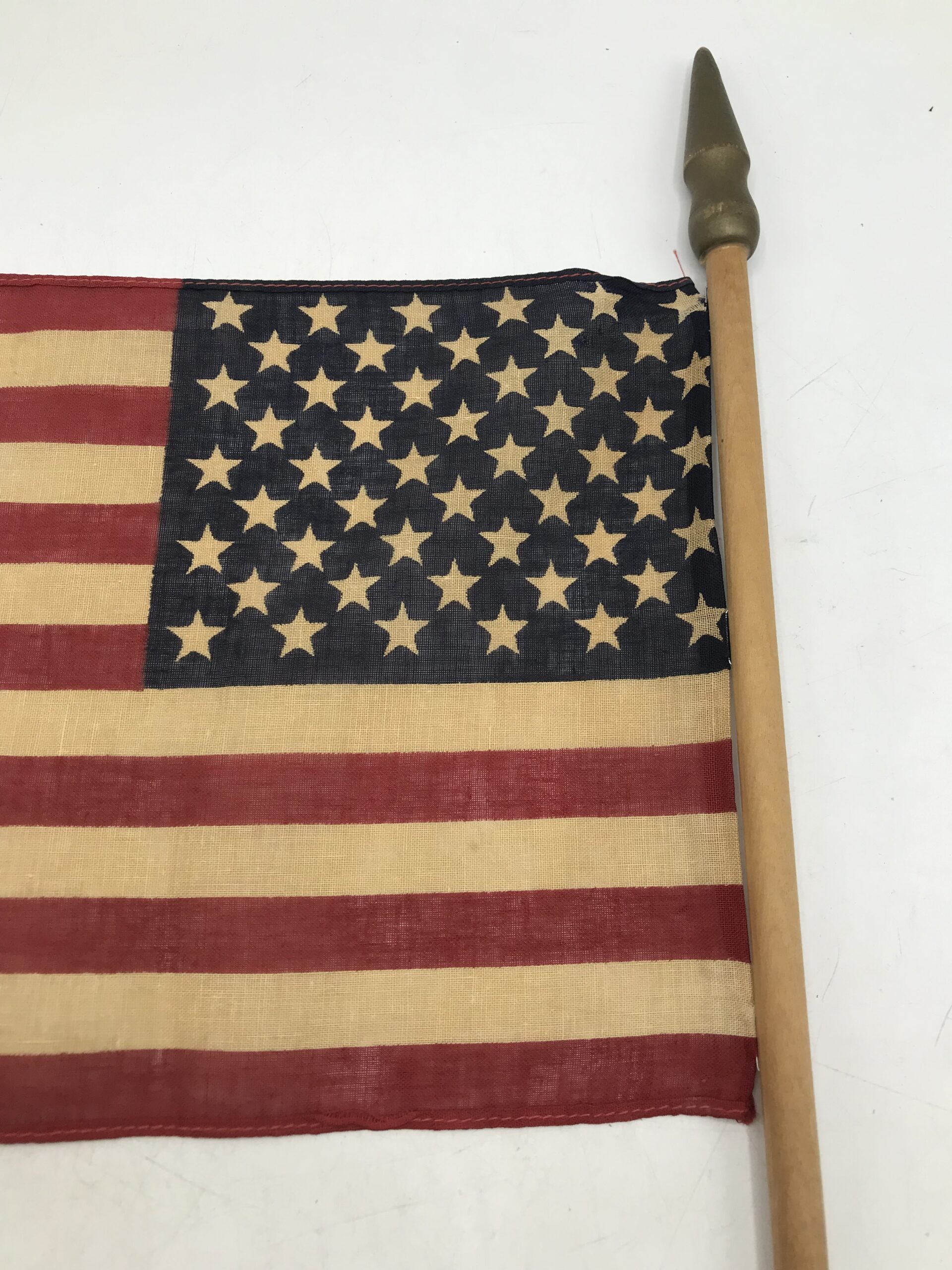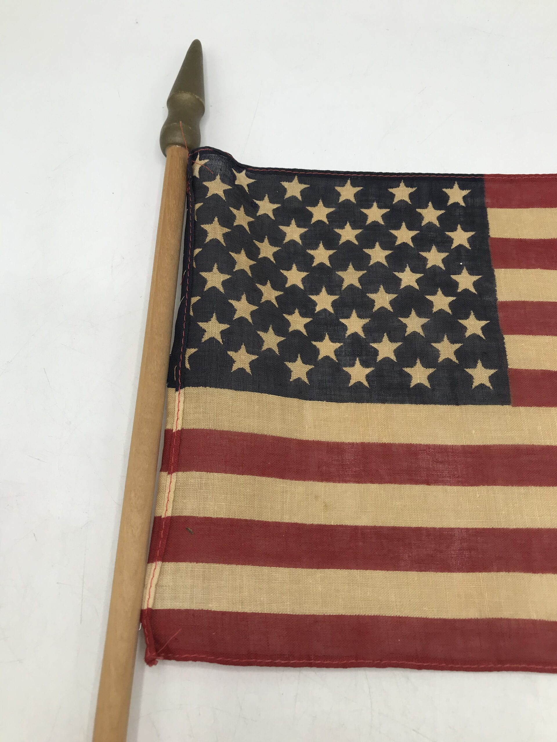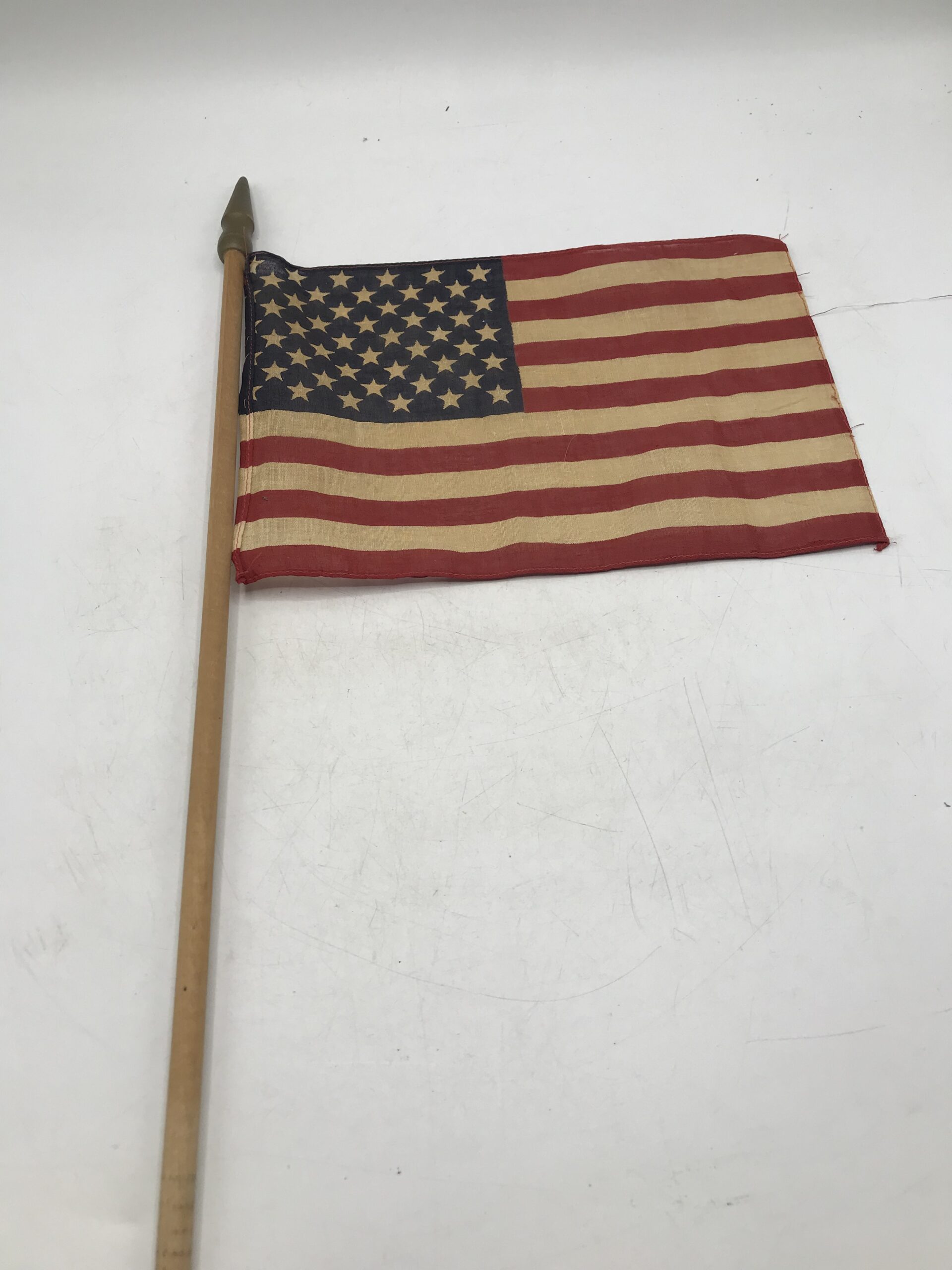 Drapeau militaire US vintage en coton. Très bel objet témoignage fort d’une époque. Ce drapeau original à traversé les époques pour que l’on garde en mémoire les temps forts du passé. Il est composé une tige en bois, avec le drapeau US en coton. La partie drapeau en coton mesure 27 cm par 19 cm. La tige en bois mesure 66 cm. Il est en bon état. Un objet de déco pour les amoureux d’histoire et de vintage.