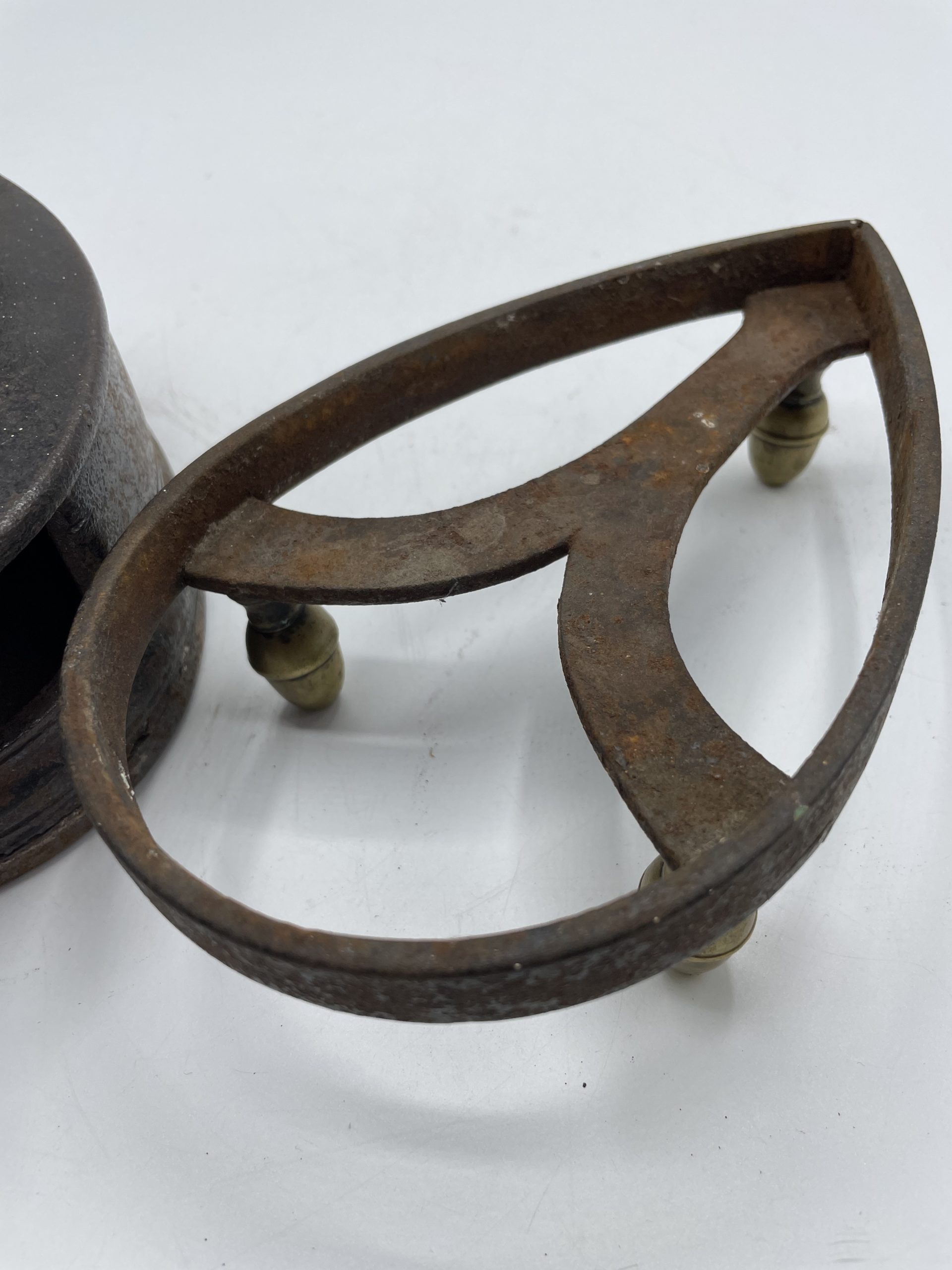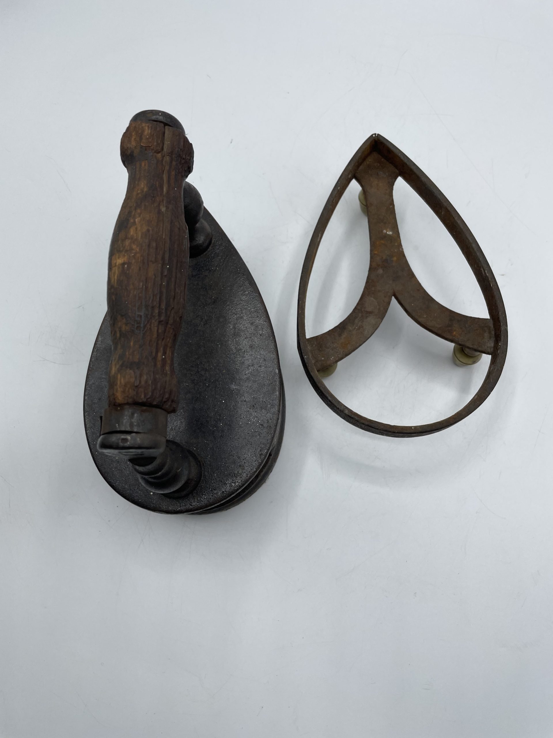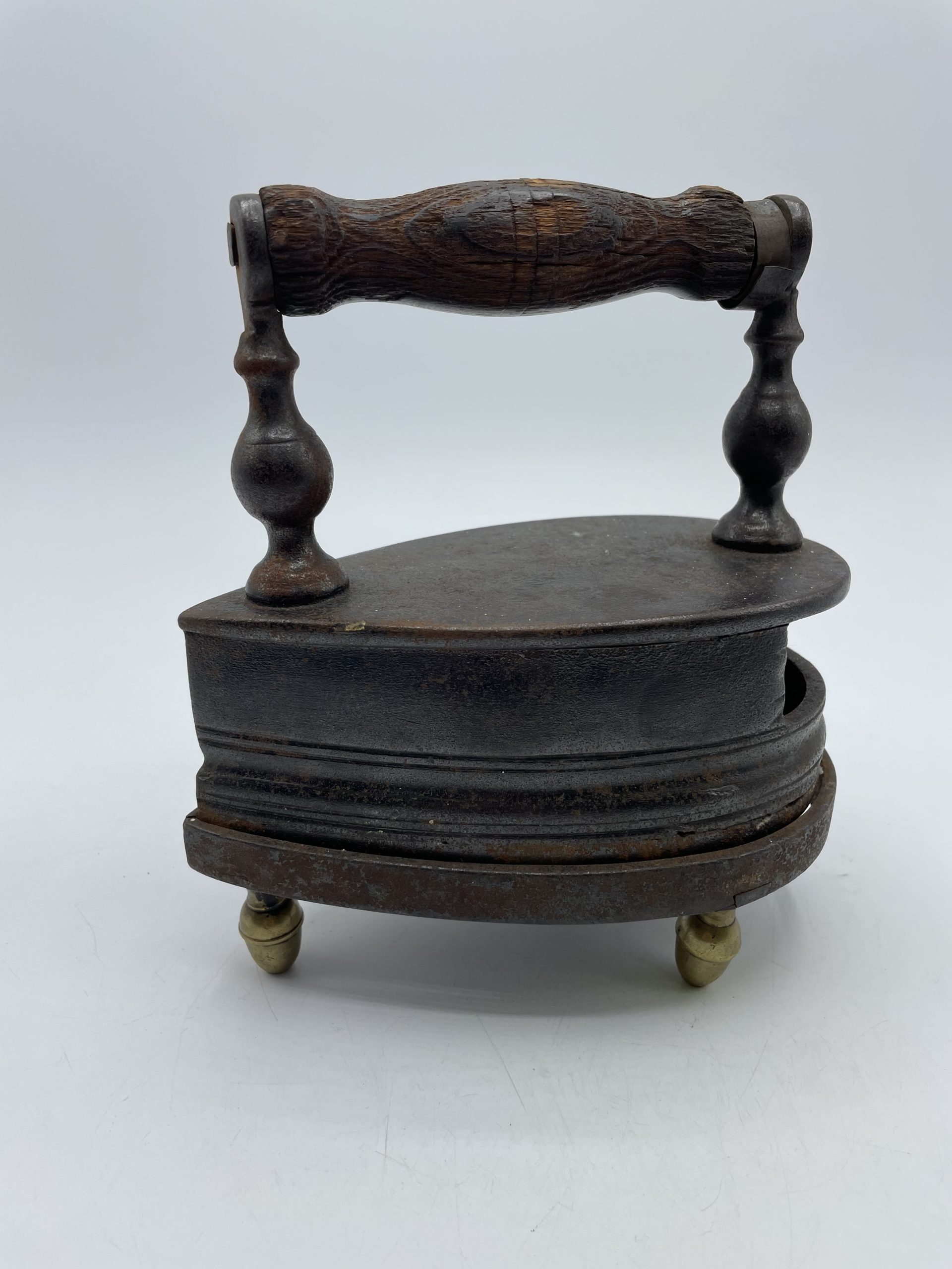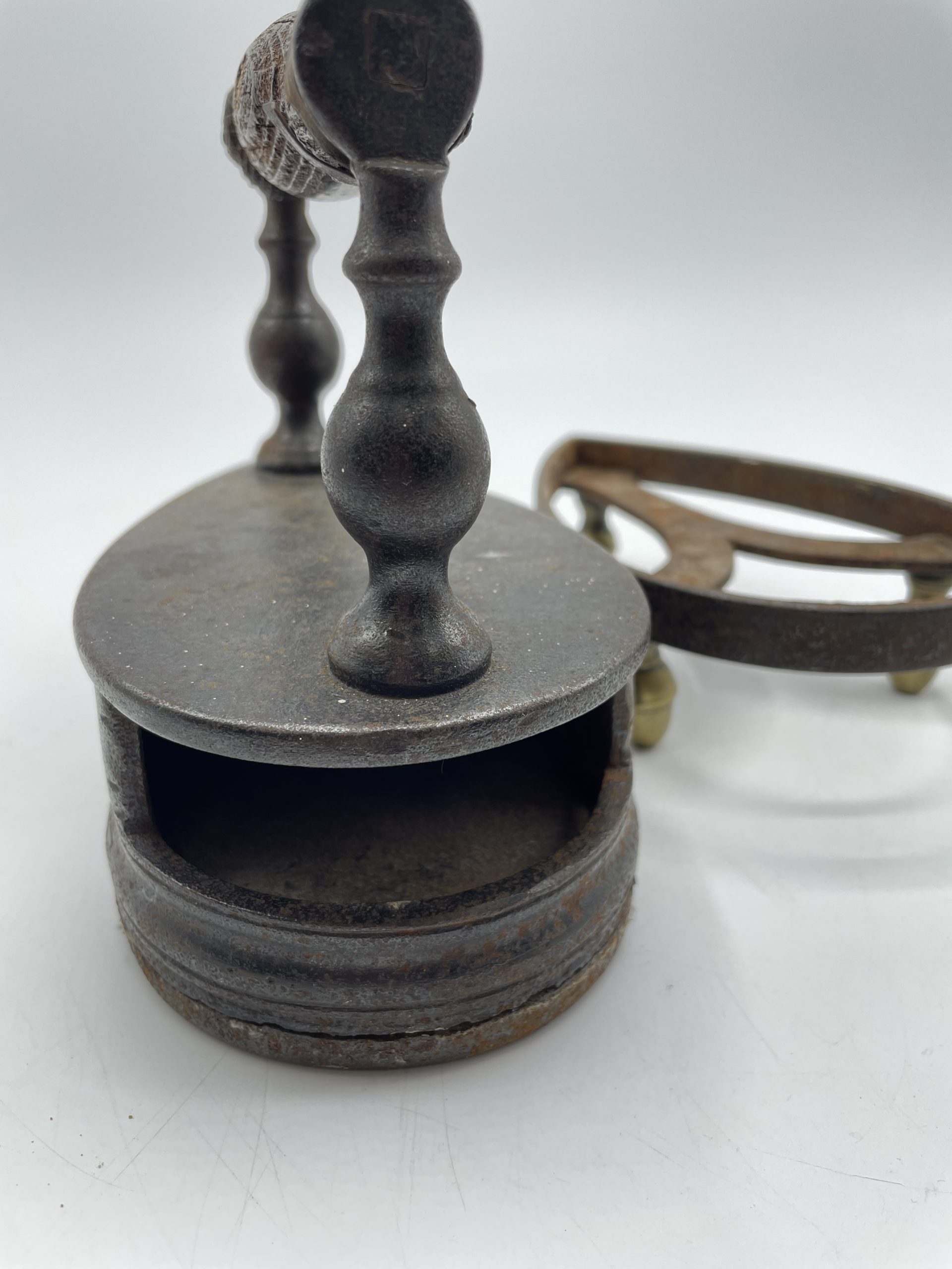 Ce joli fer à repasser vintage en fonte a un compartiment qui servait à garder les braises pour faire chauffer le fer. La poignée en bois permettait d’attraper le fer sans se brûler et on déposer ensuite le fer sur son support à pied pour ne pas qu’il brûle la table ou les vêtements. Vintage, des traces d’usure et de rouille sont à prévoir et le socle a été un peu déformé (cf photos) jolies marques du temps passé. Les pieds du support sont en laiton et l’un des pieds a été un peu déformé. Un joli fer vintage à collectionner !