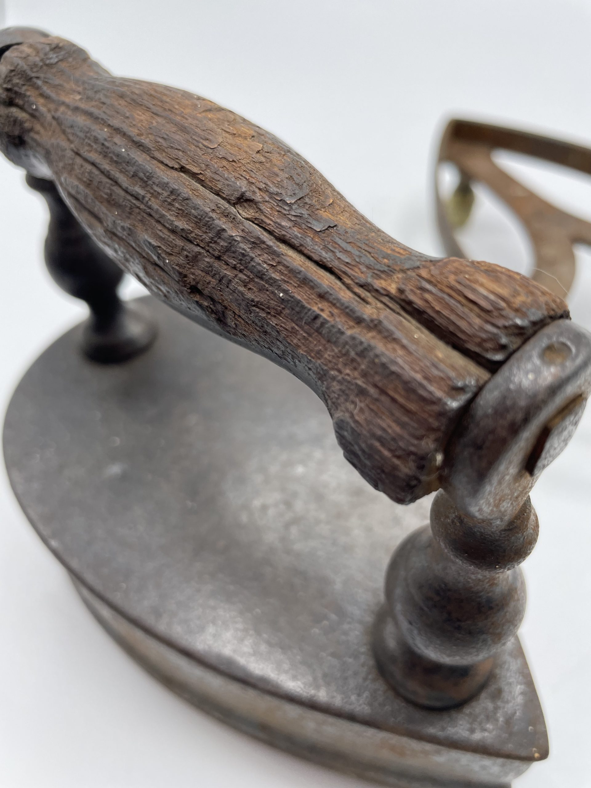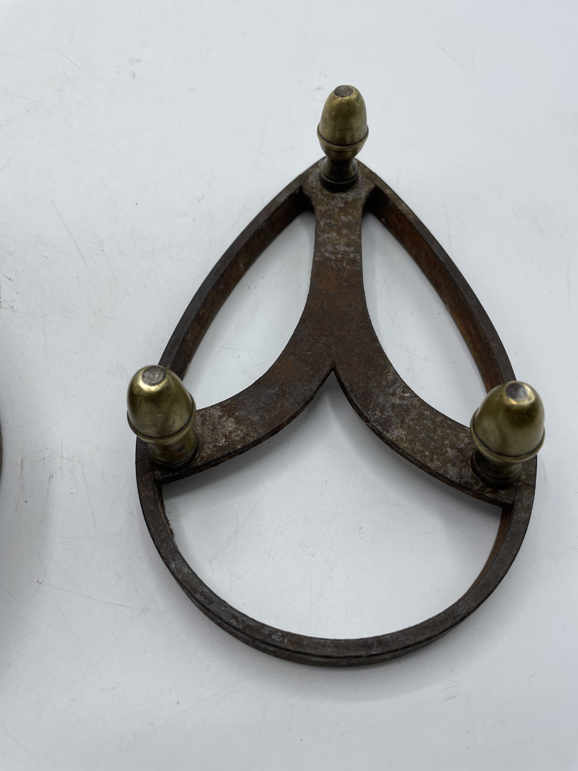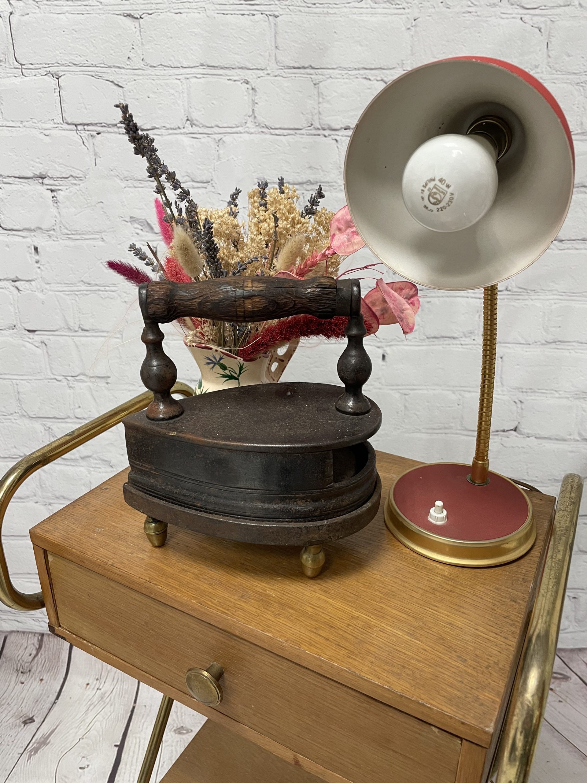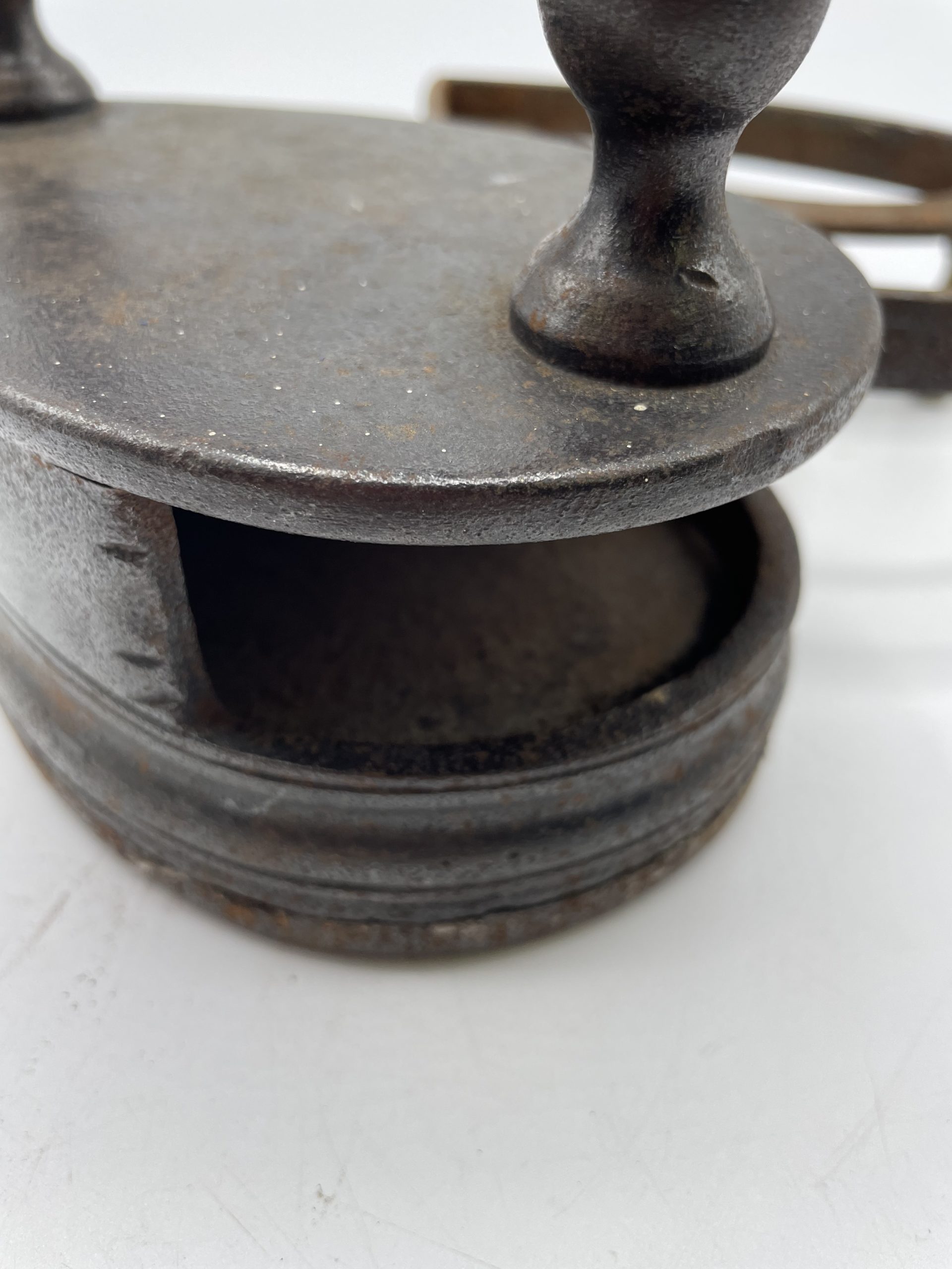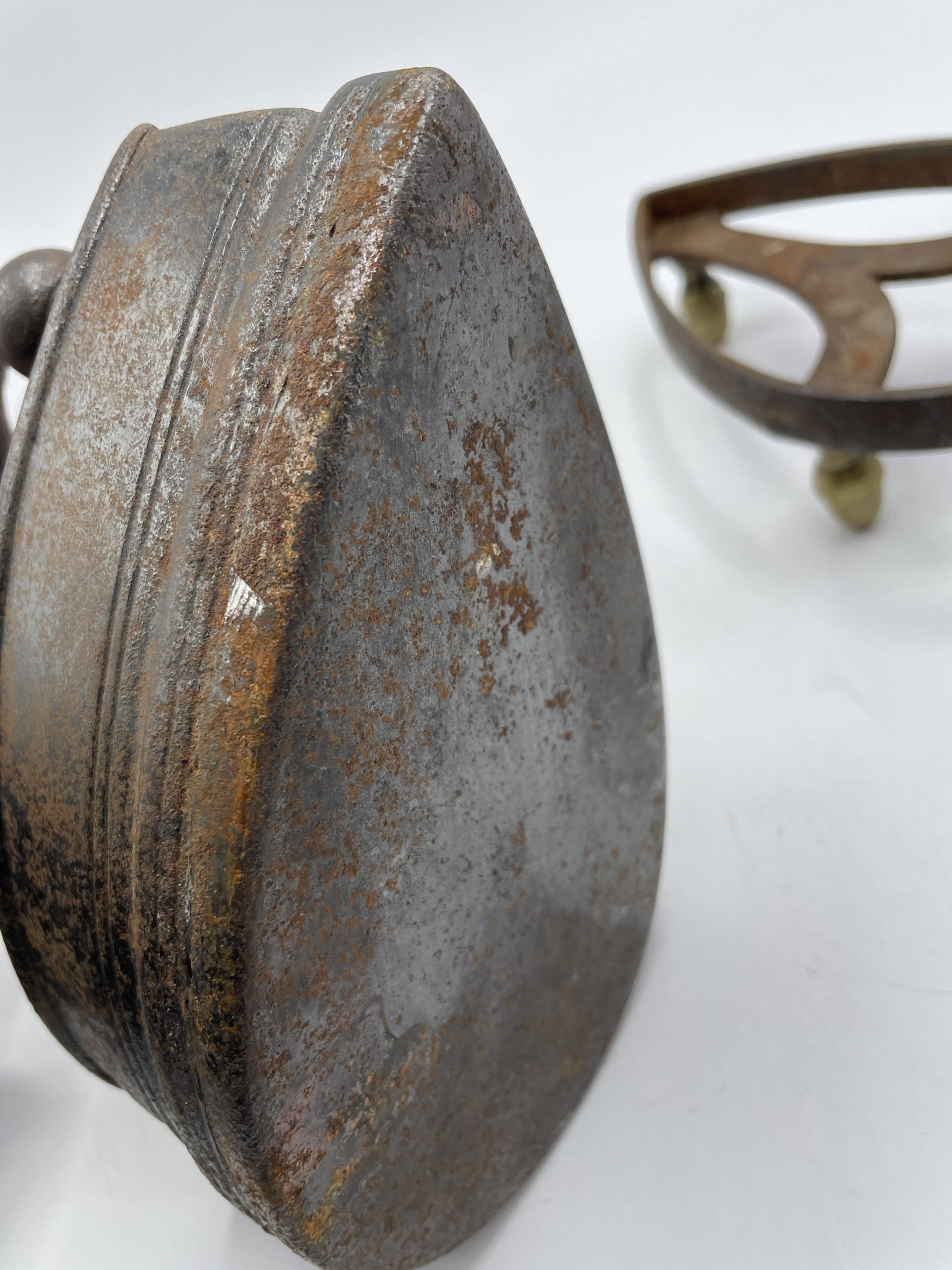 Ce joli fer à repasser vintage en fonte a un compartiment qui servait à garder les braises pour faire chauffer le fer. La poignée en bois permettait d’attraper le fer sans se brûler et on déposer ensuite le fer sur son support à pied pour ne pas qu’il brûle la table ou les vêtements. Vintage, des traces d’usure et de rouille sont à prévoir et le socle a été un peu déformé (cf photos) jolies marques du temps passé. Les pieds du support sont en laiton et l’un des pieds a été un peu déformé. Un joli fer vintage à collectionner !