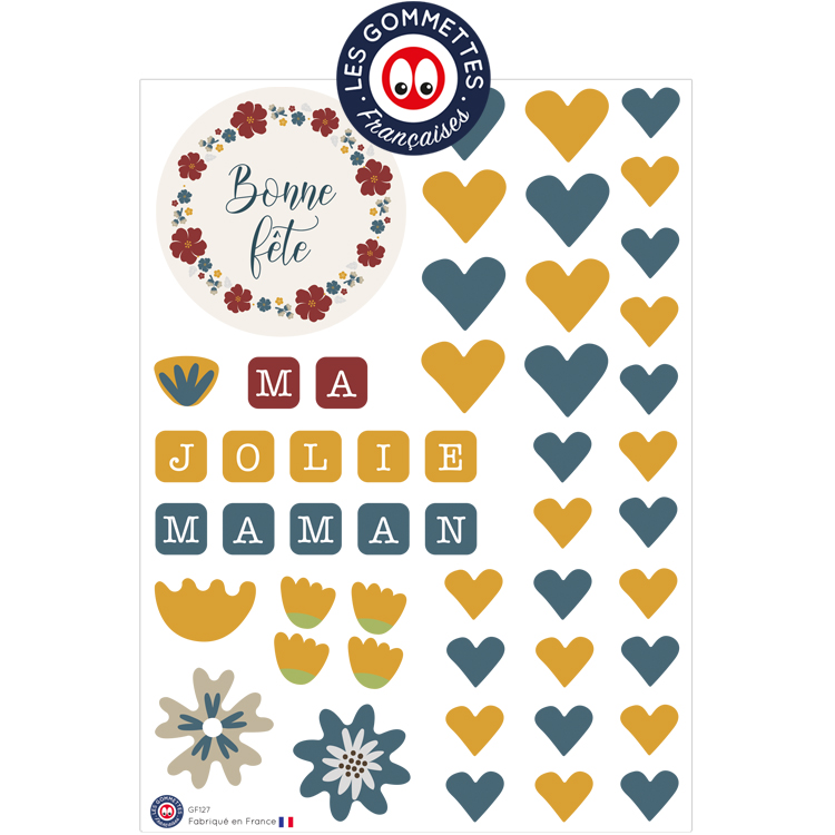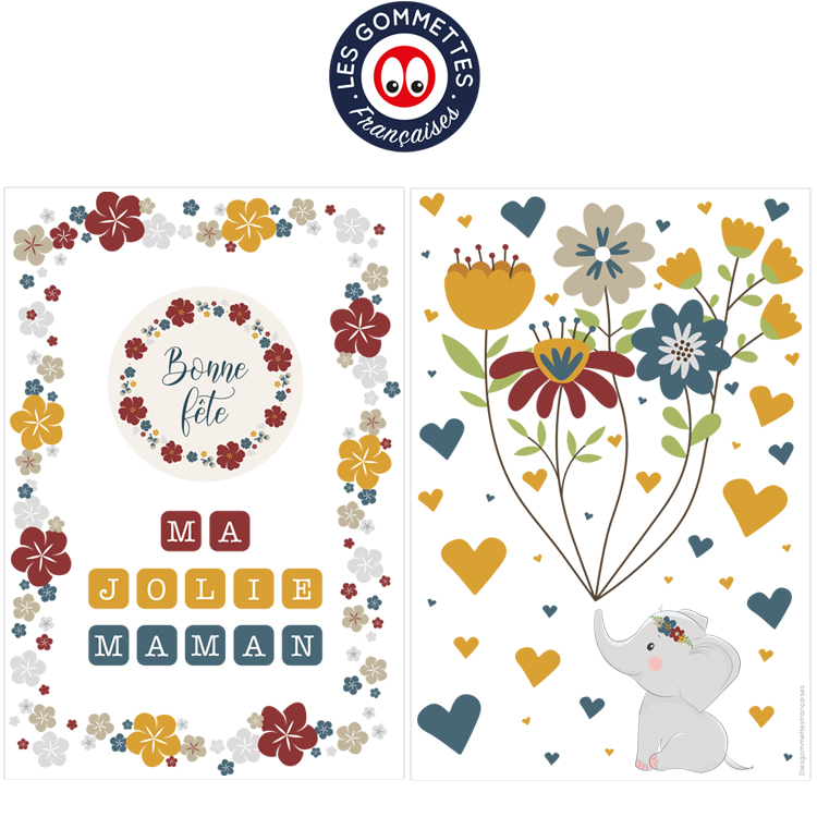 Le kit comprend : 50 gommettes Fête des mères + 1 carte recto / verso pré-imprimée à compléter.