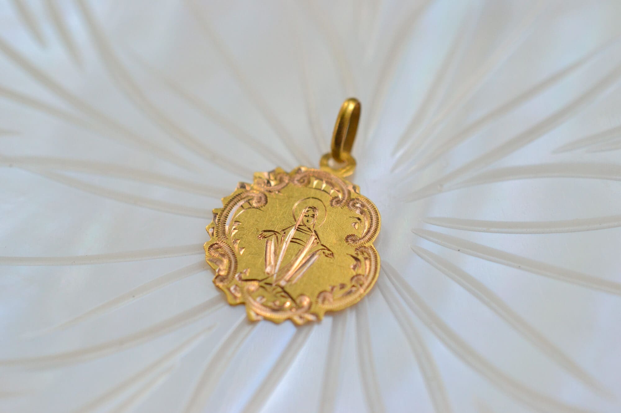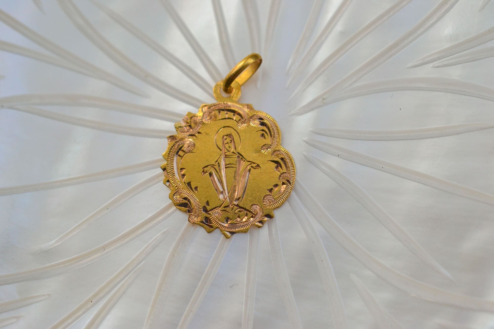 Pendentif Médaille en Or jaune 18K, à décor gravé de la Vierge dans un entourage rocaille, non gravé au revers.