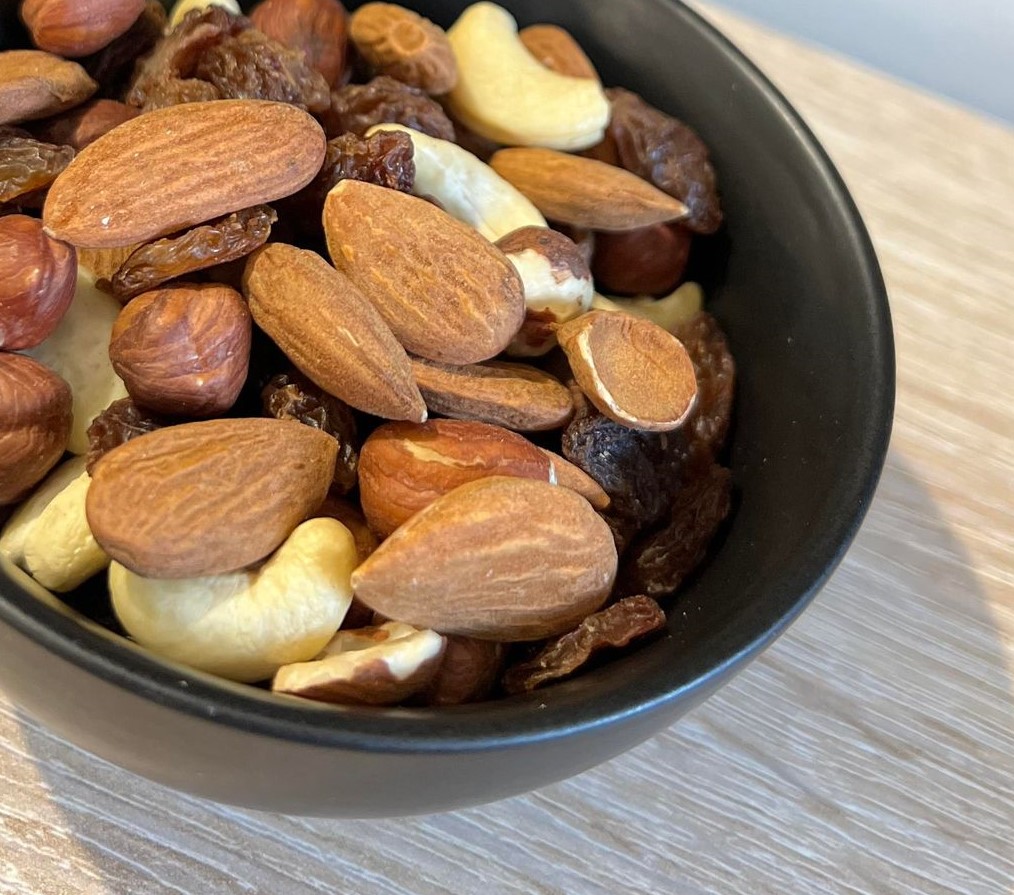 Raisin, amande, noisette, noix de cajou, noix d’Amazonie.