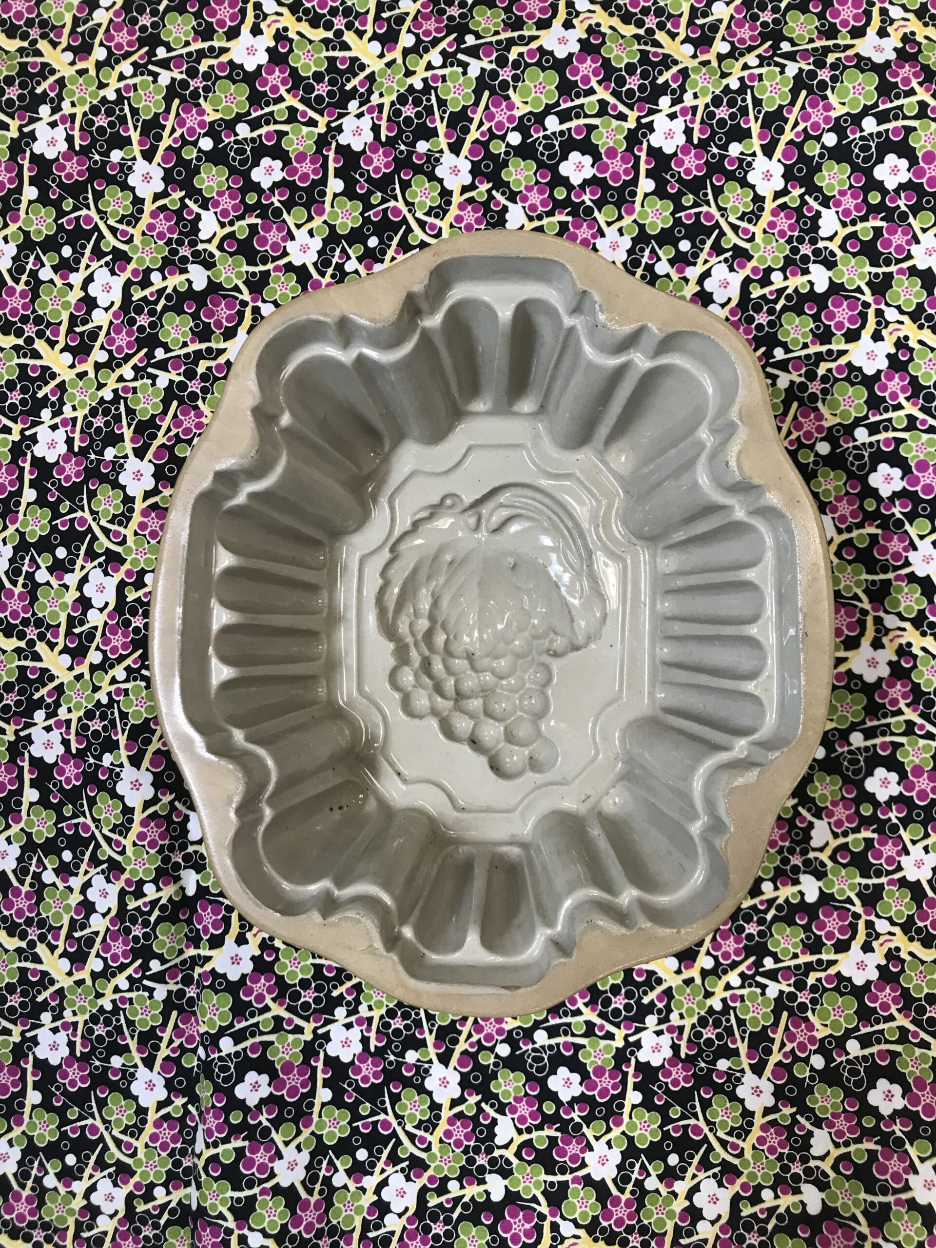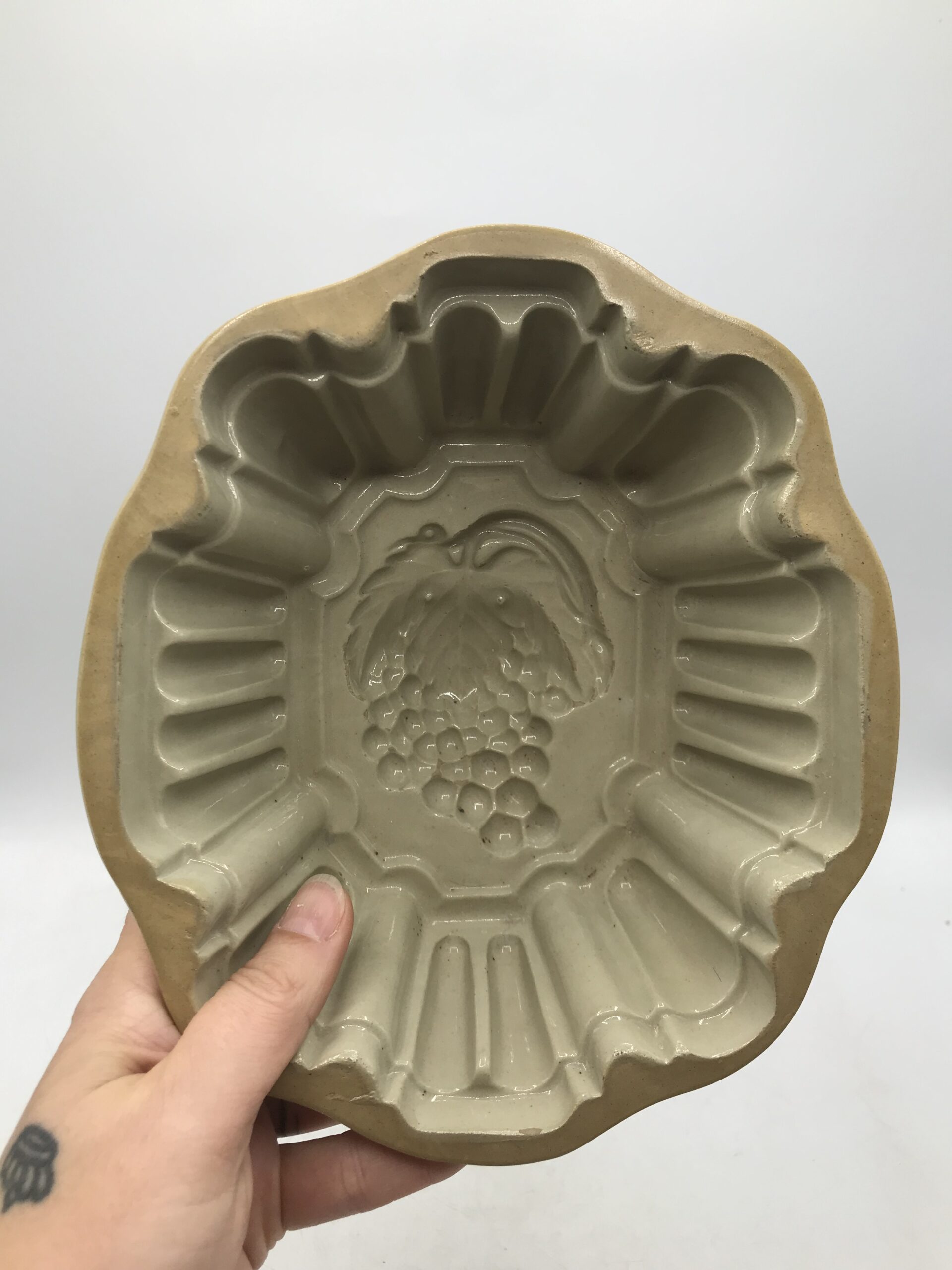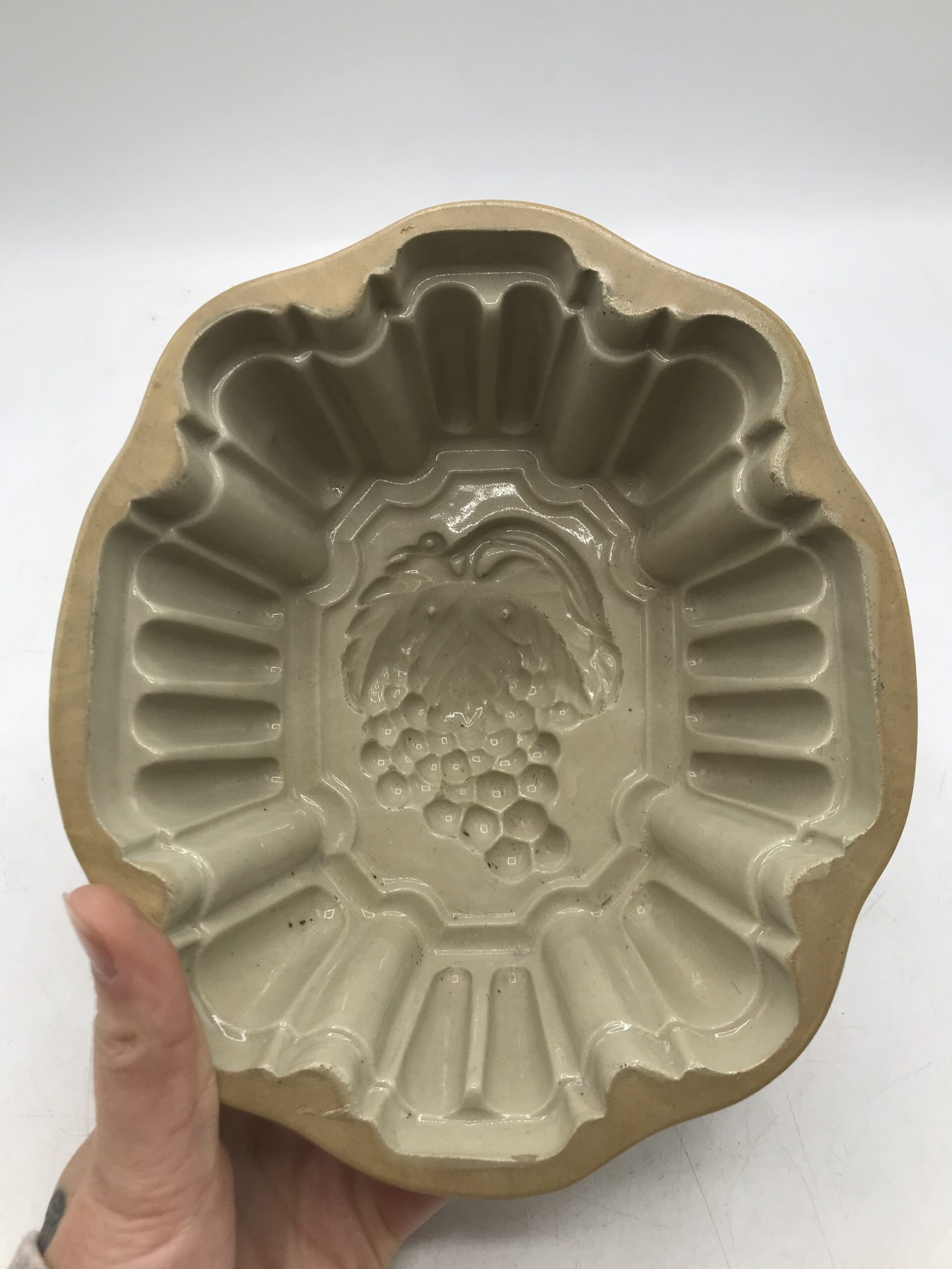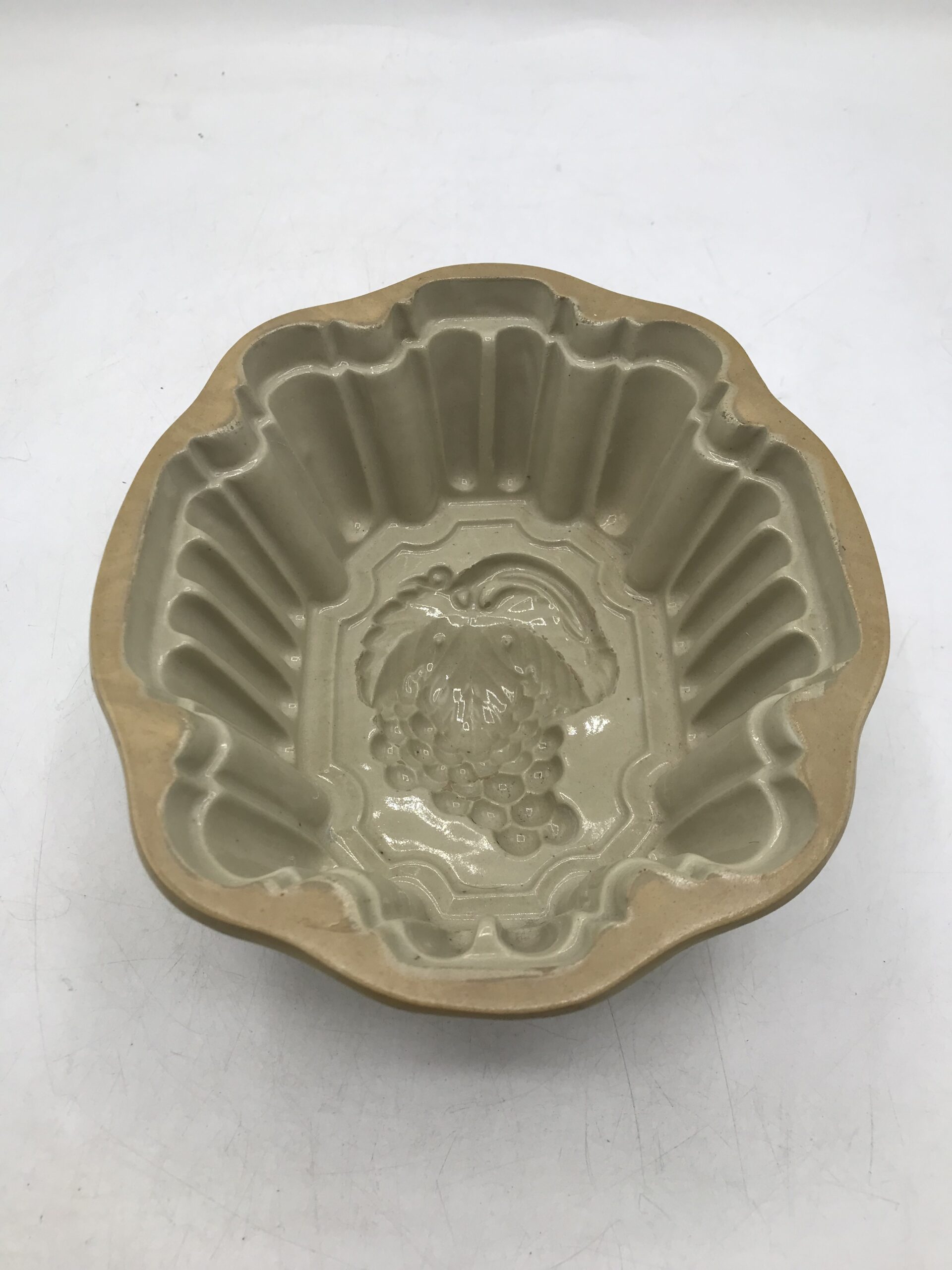 Moule à gelée poterie en grès. Très joli moule ancien en poterie grès émaille au sel. Le moule n’est pas fissuré il est en bon état général juste un petit manque d’émaille sur le fond (cf photos). Une jolie pièce de cuisine pour épater vos convives au moment du dessert. Le moule est de couler sable avec une grappe de raisin creusée dans le grès. Ce qui laissera une superbe réalisation en 3d au moment du démoulage. Le moule a une taille de 20 cm par 18 cm pour une hauteur de 9,5 cm. Amateur de cuisine traditionnelle laisser vous séduire par ce moule ancien au charme fou.