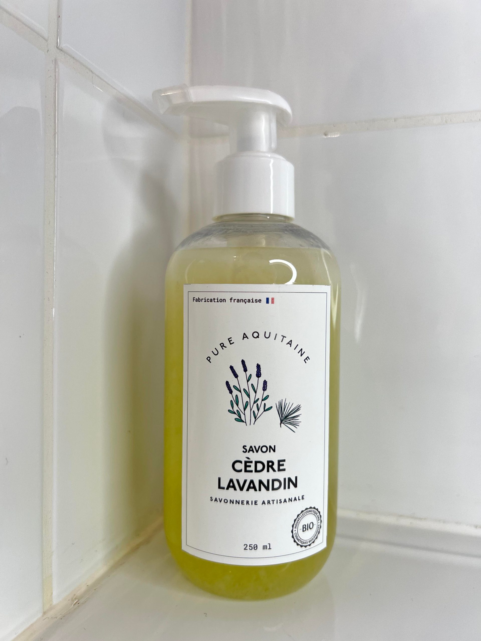 - Cèdre Lavandin (Composants végétaux : Huile d’olive bio, beurre de coco bio, huiles essentielles de cèdre et de lavandin bio, beurre de karité bio. Ingrédients : Aqua, Oléa europaea fruit oil, Cocos nucifera oil, Potassium Hydroxide, Butyrospermum Parkii Butter, Sodium Chloride, Cedrus atlantica bark oil, Lavandula hybrida oil, Linalool* (* Naturellement présent dans les huiles essentielles)