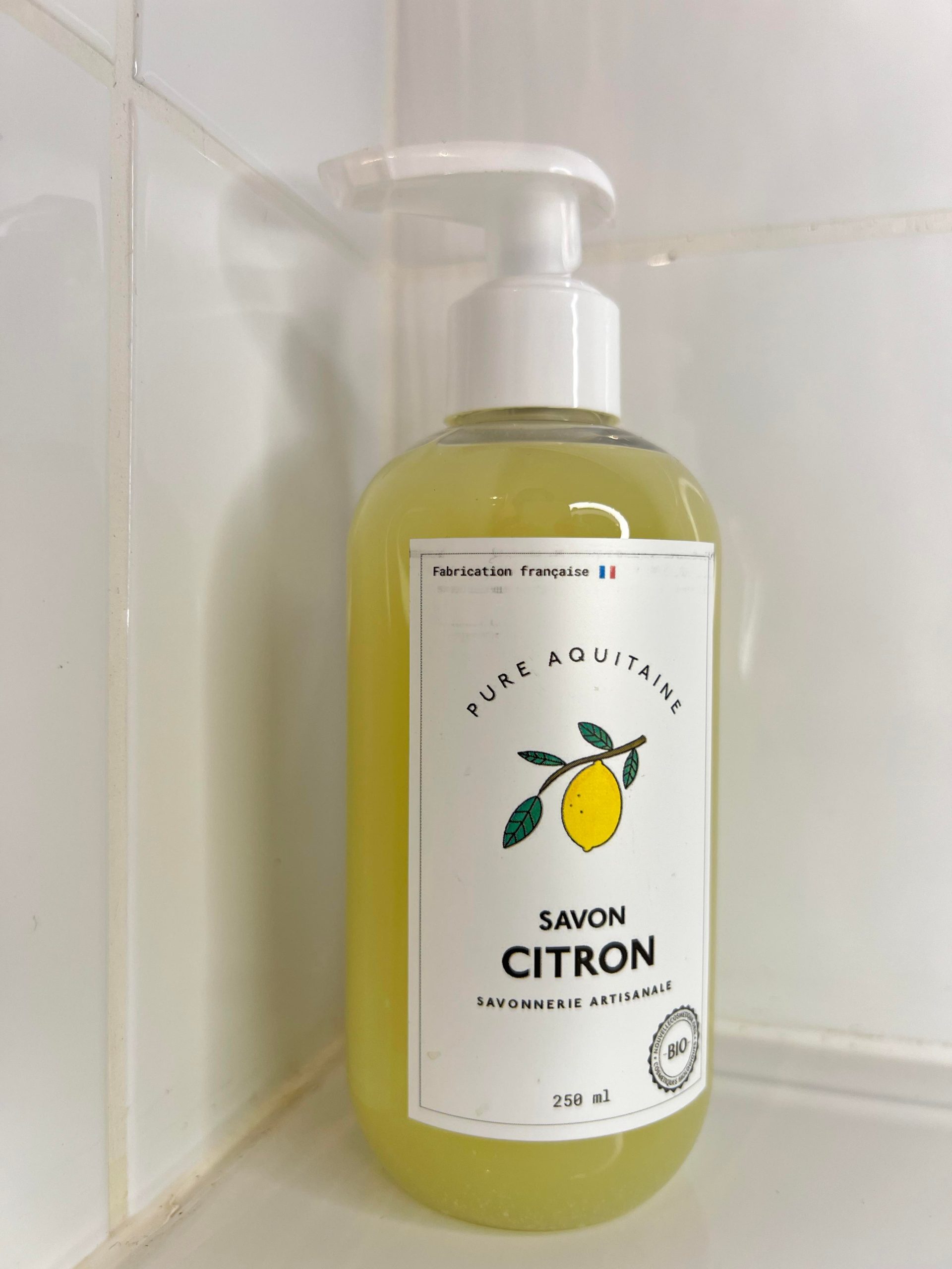 - Citron (Composants végétaux : Huile d’olive bio, beurre de coco bio, huile essentielle de citron bio, beurre de karité bio. Ingrédients : Aqua, Oléa europaea fruit oil, Cocos nucifera oil, Potassium Hydroxide, Butyrospermum Parkii Butter, Sodium Chloride, Citrus limon peel oil, Limonene*, Citral* (* Naturellement présent dans les huiles essentielles)