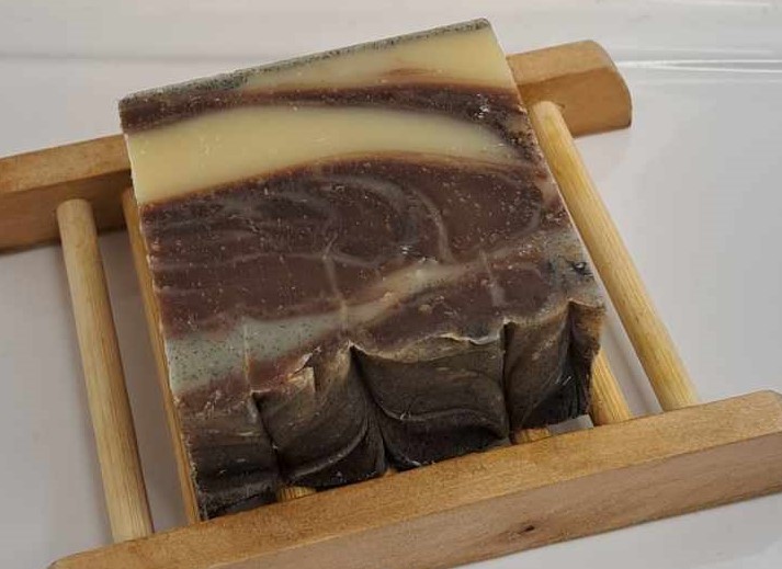 Le savon patchouli épicé, savon surgras – saponifié à froid – à base d’huile d’olive et de beurre de karité – est enrichi au charbon végétal, coloré au chocolat (poudre de cacao) et parfumé aux huiles essentielles de patchouli et girofle.
