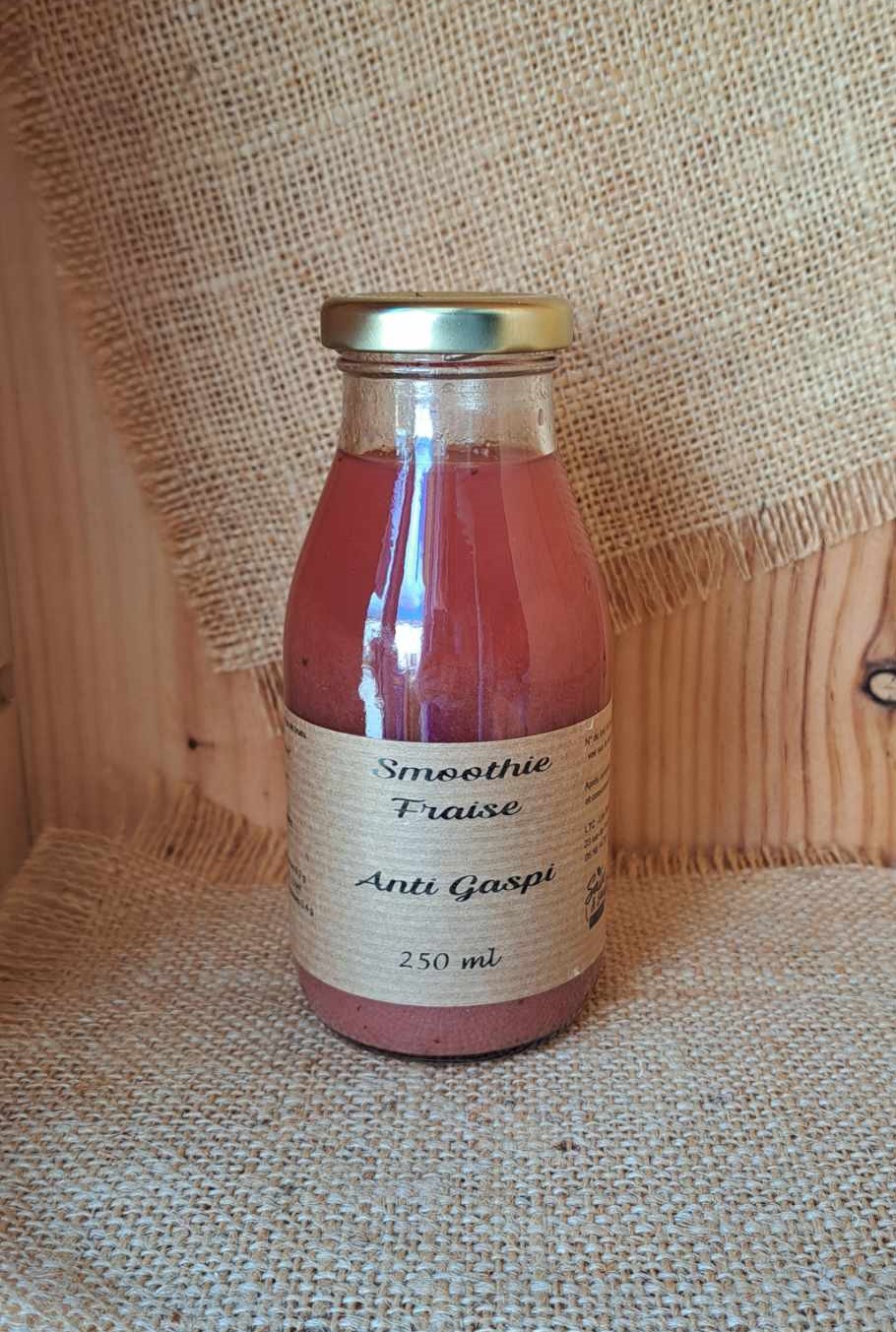 Composition : Jus de pomme, fraises* (28,1 %), eau, banane*, framboises, jus de citron. * produits issus de notre filière « lutte contre le gaspillage alimentaire »