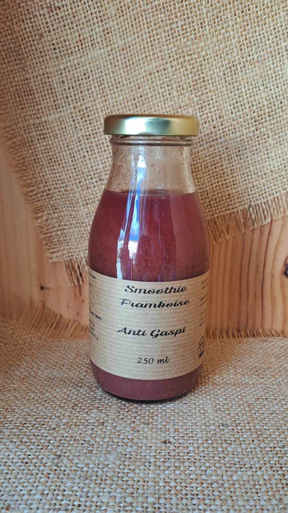 Composition : Jus de pomme, framboises* (20 %), eau, banane*, jus de citron. * produits issus de notre filière « lutte contre le gaspillage alimentaire »
