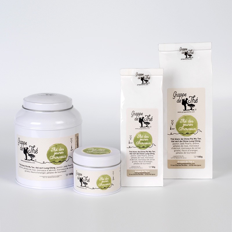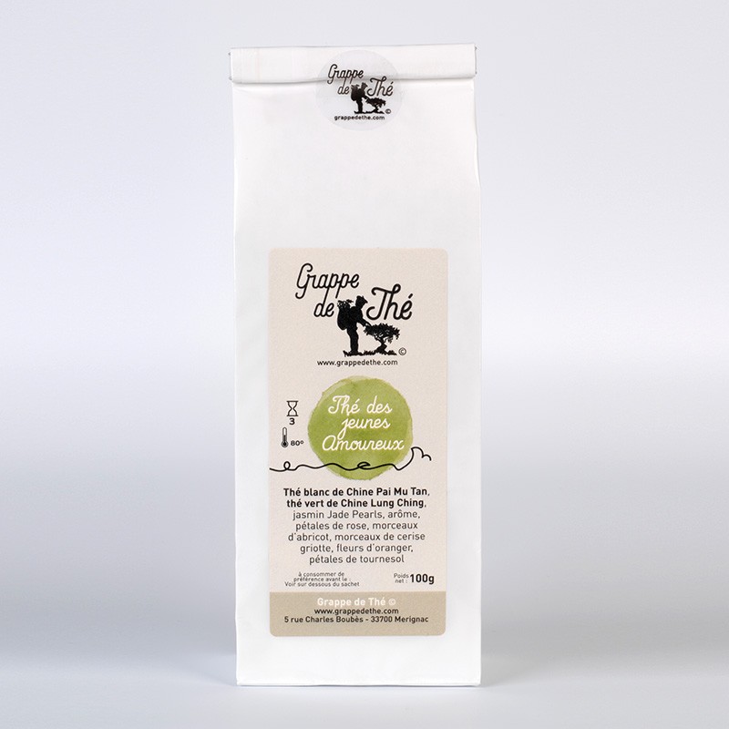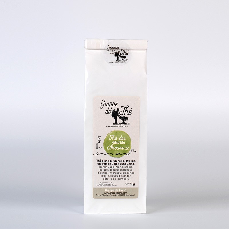 Thé blanc de Chine Pai Mu Tan, thé vert brouillard de Chine, thé vert de Chine Lung Ching, thé vert de Chine Jasmin Jade Pearls, arôme, pétales de rose, morceaux d’abricot (abricots, farine de riz), morceaux de cerise griotte, fleurs d’oranger, pétales de tournesol.