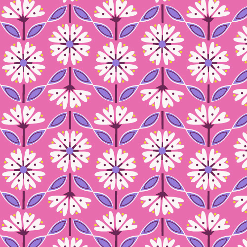On retrouve une modernité certaine dans cet imprimé aux notes vintage. Les couleurs sont plutôt peps : fleurs découpées au feuillage bleu cobalt, fond tonique rose cyclamen.