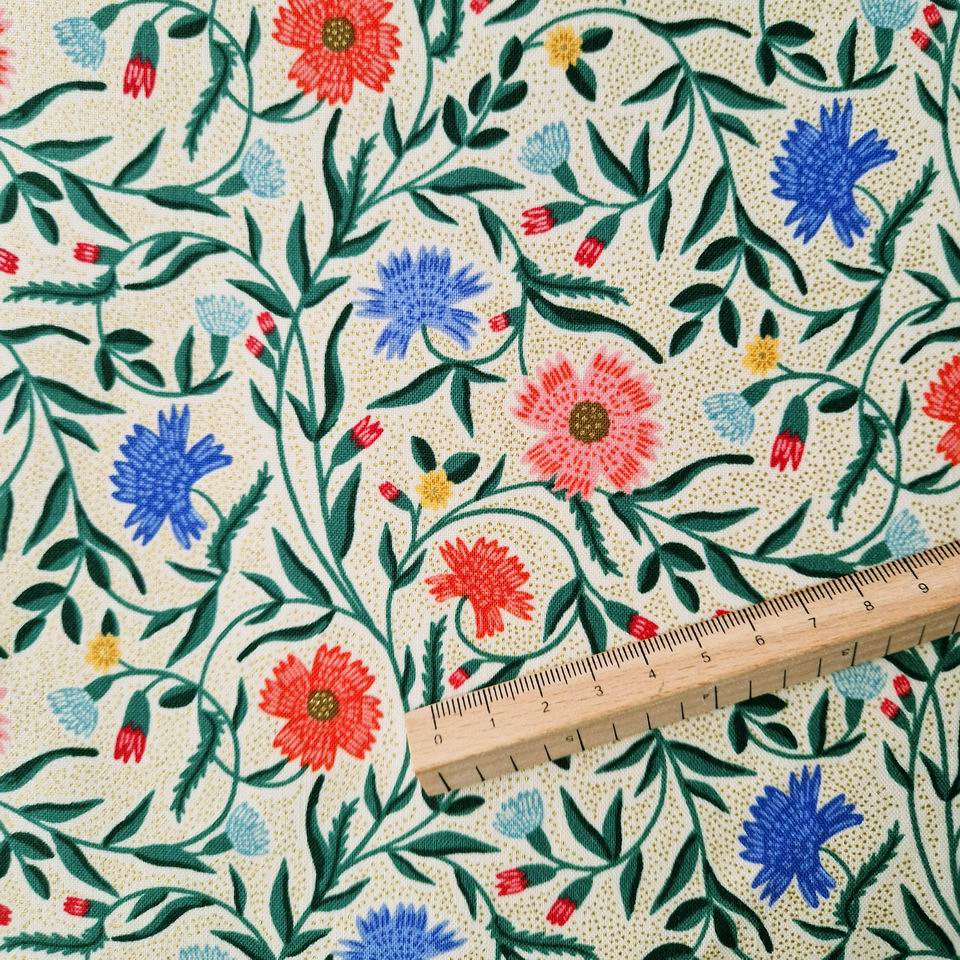 La palette de couleurs est donc délicate, colorée, dans un esprit vintage. Un entrelac de bleuets, des éclats de couleurs corail et bleu lavande, sur ce fond ivoire. Des micro points or métallisé, comme du pointillisme donne des reflets à ce tissu, ils captent la lumière, comme un tissu changeant.