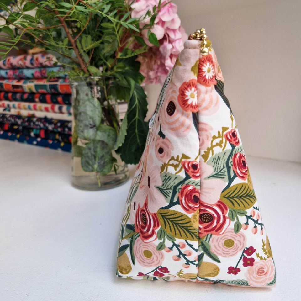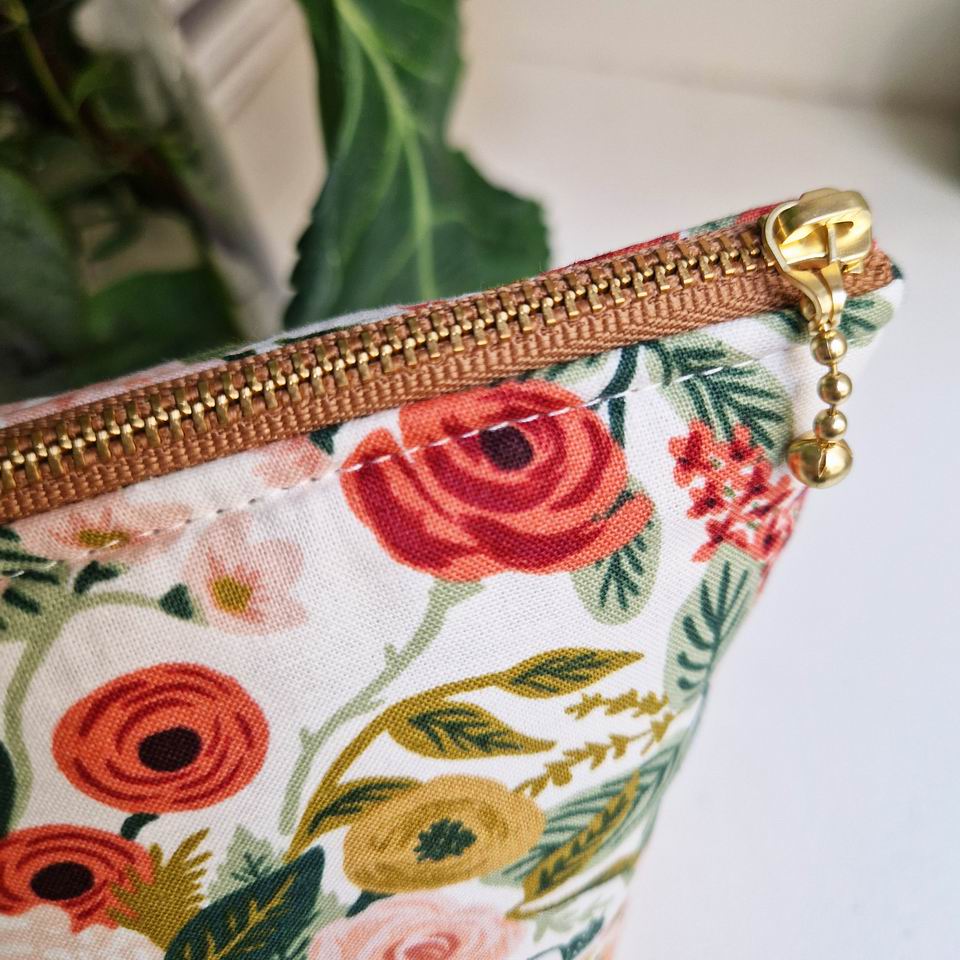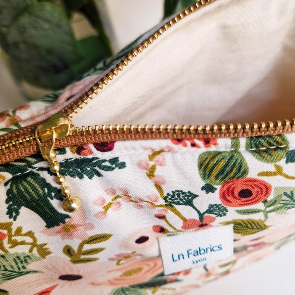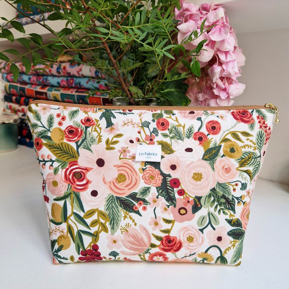 Trousse en tissu molletonnée, imprimé Garden Party Fleurs Rose thé de chez Rifle Paper Co ; à l’intérieur, une doublure en coton blanc naturel pour la touche délicate et raffinée !