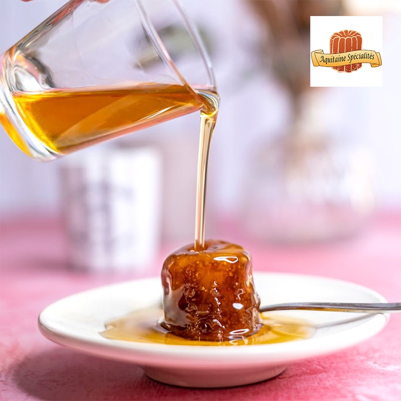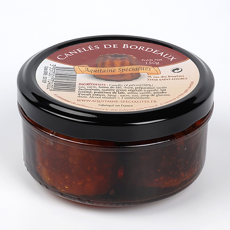 INGRÉDIENTS : sirop (55%) : sucre, eau sirop de glucose, rhum (12%). Canelés – 4 pièces (45%) : eau, sucre, farine de blé, rhum, préparation alimentaire (poudre de lactosérum, matière grasse végétale (coprah), protéines de lait, poudre de lait écrémé), poudre d’œufs entiers, arôme vanille. Alcool résiduel : < 4,8 unités par volume.