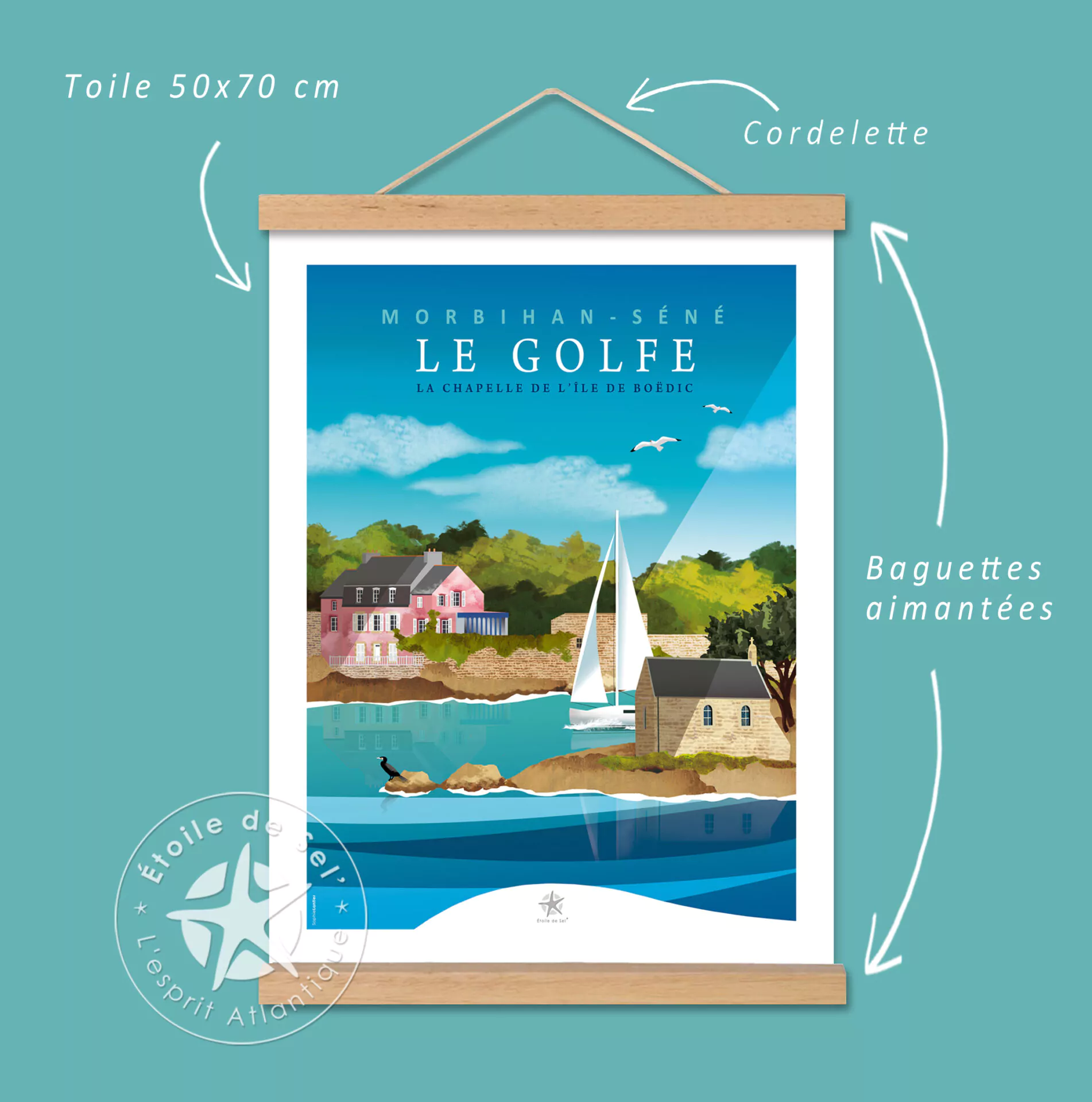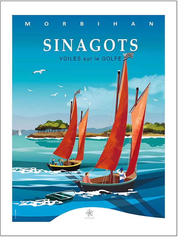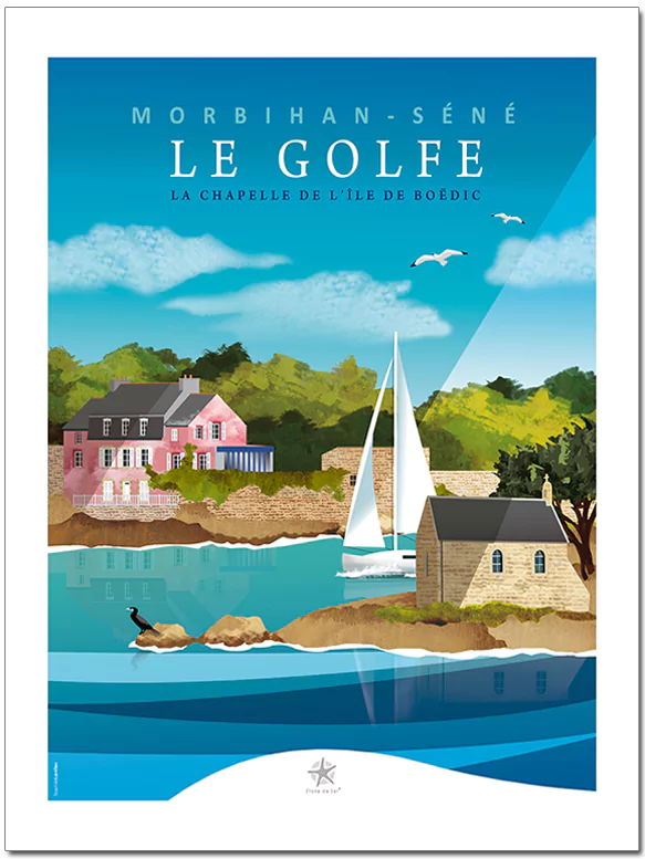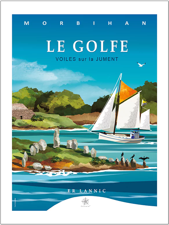 Voiles sur le Golfe est un clin d’œil à l’histoire du Golfe du Morbihan qui a toujours possédé un trafic maritime spécifique. À la fois pour relier les îles au continent, mais aussi pour la pêche et la plaisance. Retrouvez sur nos 3 affiches quelques emblèmes du Golfe qui vous plongeront dans son ambiance traditionnelle et intemporelle.