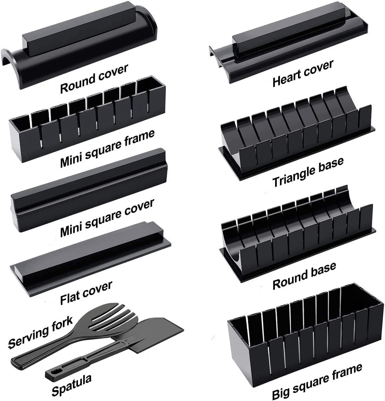 【11 pièces, 5 formes】Avec ce kit complet de fabrication de sushis, vous pouvez faire des sushis en forme de triangle, en forme de cœur, rond classique, grand carré et petit carré.